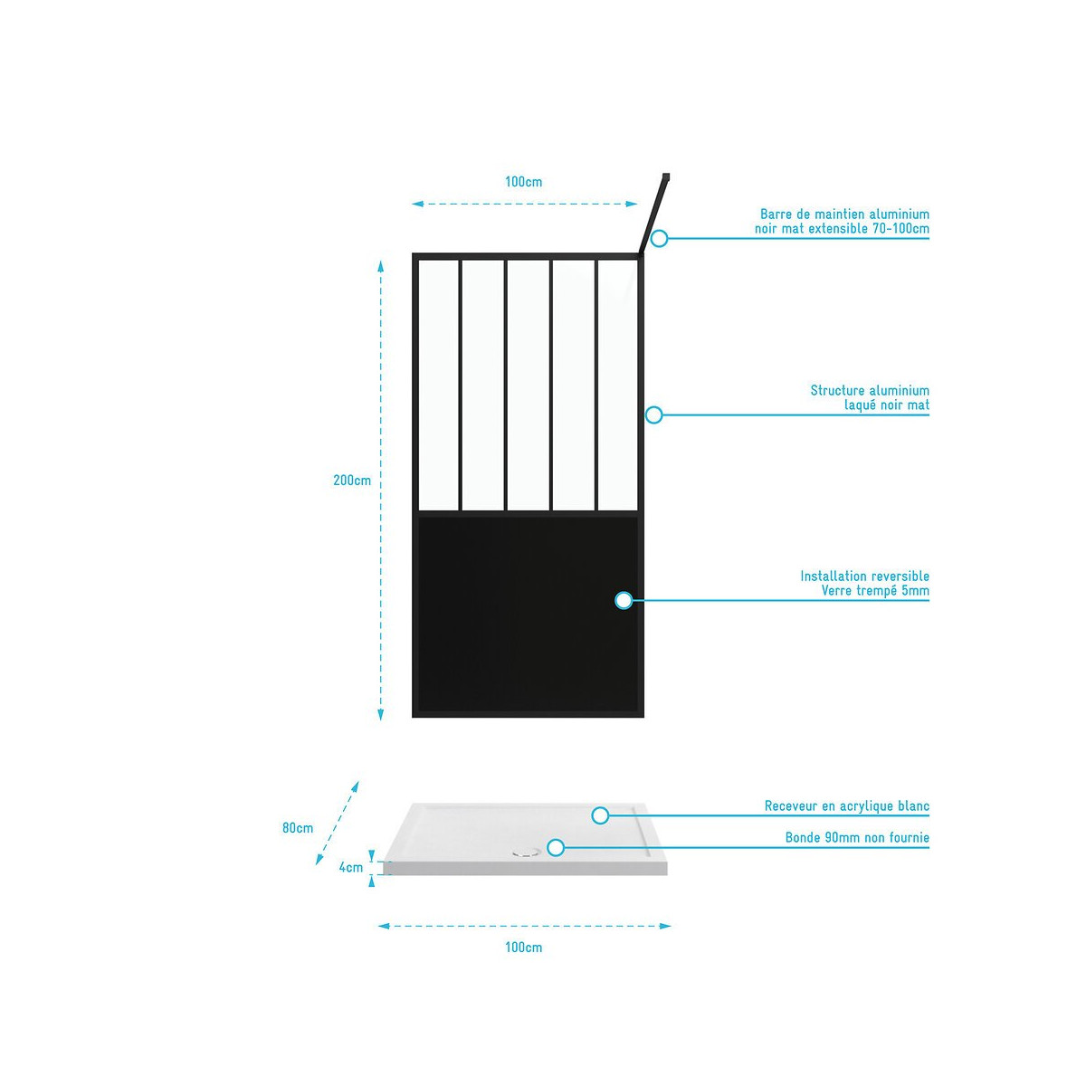 Caractéristiques de la paroi : Barre de maintien en aluminium noir mat extensible 70-100cm Structure en aluminium laqué noir mat Installation réversible Verre trempé ép. 5mm Dimensions 100x200 cm Caractéristique du receveur : Receveur en acrylique blanc Faible épaisseur : 4 cm À poser ou à encastrer dans le sol bonde 90 mm non fournie Dimensions du receveur : 100x80x4cm Réference du produit: PACF056 Désignation du produit: GLASSY 100 + WHITENESS II 100 Garantie 2 ans pièces et non main d'oeuvre. Profilé noir mat thermolaqué : Le thermolaquage est une technique de traitement spécifique réservé aux matériaux en métal ou en aluminium brut. On projette de la peinture en poudre chargée en électricité statique qui va se déposer sur toute la surface des profilés. Cette technique de pulvérisation en poudre , qui s’appelle projection électrostatique ou poudrage électrostatique, permet d'avoir un revêtement complètement uniforme sur tous les profilés. Ce type de traitement dispense l’utilisation de produits chimiques nocifs pour la santé et l’environnement comme les solvants. Après avoir été recouverte de poudre, la pièce doit passer dans un four où elle sera chauffée pendant 20 minutes à 200°C. Les avantages du thermolaquage : Cette technique possède de nombreux avantage, qui sont La surface peinte possède une dureté supérieure ce qui a pour conséquence une résistance aux chocs accrue Le thermolaquage a une meilleure résistance à la corrosion La couleur des profilés thermolaqués résiste mieux au vieillisement et tout autres élément tel que l'humidité etc. Les profilés thermolaqués présentent une meilleure finition, fini les coulures de peinture et défauts d'aspect, avec cette technique la surface est uniforme Sans solvant c'est un véritable plus pour la santé Mais aussi plus écologique (pas de solvants) Dans un souci de qualité mais aussi de sécurité nos produits répondent à toutes les normes Européennes en vigeur. Que ce soit en terme de sécurité en cas de casse, d'entretien de nos produits ou de la durée de vie de ces derniers, nos produits remplissent tous les critères. Verre trempé : Le verre trempé est un verre qui a subi un traitement afin d’améliorer ses propriétés. Nous utilisons la trempe thermique qui consiste à porter le verre à très haute température (environ à 700 °C), puis de le refroidir rapidement. Ce processus favorise l'apparition de tensions en profondeur et celle de la compression à la surface du verre. Tout cela a pour effet l’amélioration de sa résistance aux chocs. Il est de 2 à 5 fois plus résistant que le verre simple. Mais aussi diminue grandement la dangerosité du verre car en cas de casse le verre explose en de petits morceaux et non pas en de grands pans tranchants. Pour le reste il conserve les mêmes propriétés que le verre classique Norme harmonisée : EN14428:2004 Certification Européenne: Aptitude au nettoyage : EN14428 :2004+A1:2008 Clause 4.2 Résistance à l’impact / Propriétés d’éclatement: EN14428:2004+A1:2008 Clause 4.3 Durabilité : EN14428:2004+A1:2008 Clause 4.4 MyShowerRoom c’est aussi la garantie de durabilité : Nous garantissons un stocks de pièces détachées d’au moins 5 ans Notre visserie est en acier inoxydable ce qui est une garantie anticorrosion Garantie 2 ans pièces uniquement Cocorico ! MyShowerRoom est une entreprise Française et toute la conception de nos produits est également Française. Ce qui est un véritable plus pour être au plus près de ses clients et avoir une meilleure connaissance de leurs attentes. Qui sommes nous L’HISTOIRE DE MYSHOWERROOM Nous avons créé MyShowerRoom en 2003 avec l’ambition de démocratiser le design et l’innovation dans la salle de bain pour faire de cette pièce un lieu à part entière, un véritable lieu d’histoires à vivre pour toute la famille. Nos cabines de douche et meubles de salle de bain dans l’ère du temps à des tarifs très accessibles. Nos nombreux brevets garantissent l’originalité de notre gamme de cabines de douches. Et nos ingénieurs mettent en œuvre tout leur savoir-faire et toutes les technologies innovantes au service d’une simplicité d’installation et d’utilisation incomparable pour tous. ÊTRE BIENVEILLANT AVEC NOS CLIENTS Notre service client a un objectif : rendre nos clients heureux. Pour cela nous veillons à répondre dans les 24h aux demandes clients. Mais aussi de toujours apporter une solution et entière satisfaction à nos clients. CONSTRUIRE DES PRODUITS TOUJOURS PLUS PERFORMANTS Nos ingénieurs, ainsi que nos équipes terrain consacrent tous leurs efforts à créer des produits adaptés à vos besoins, et toujours plus innovants grâce à nos technologies. Notre objectif est d’être votre unique interlocuteur pour tous vos projets de salle de bain. CONCRÉTISER LES RÊVES DE CHACUN Un projet de salle de bain ? Nous le réalisons ! Lieu de détente et de relaxation par excellence, la salle de bain est une des pièces maîtresse de la maison. Chez MyShowerRoom, nous mettons tout en oeuvre afin que ce rêve devienne réalité. PROPOSER UNE GAMME COMPLÈTE DE PRODUITS Nous vous proposons grâce à notre boutique en ligne une gamme complète de produits Made in MyShowerRoom pour équiper, et accessoiriser votre salle de bain. Un catalogue que nous renouvelons régulièrement avec les dernières technologies MyShowerRoom. APPORTER UNE EXPERTISE HUMAINE Parce que l’humain passe avant tout, nous travaillons avec les meilleurs experts. La satisfaction de nos clients est notre seule et unique priorité. Chaque problème a une solution, et c’est dans cette optique que nous avons mis en place un chat pour échanger directement avec nos équipes. NOTRE CENTRE LOGISTIQUE 11 000 m² d’entrepôt 7000 palettes en stock 1 800 colis traités par jour Plus de 260 préparations de commandes quotidiennes 12 quais de chargement/déchargement CONSE