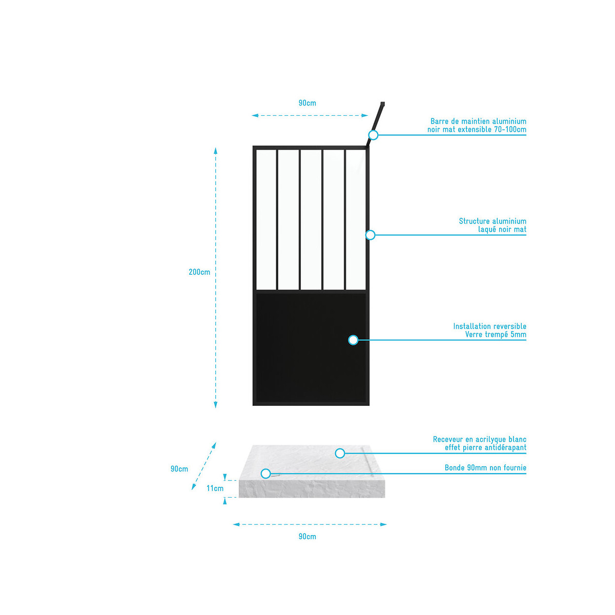 Caractéristiques de la paroi : Barre de maintien en aluminium noir mat extensible 70-100cm Structure en aluminium laqué noir mat Installation réversible Verre trempé ép. 5mm Dimensions 90x200 cm Caractéristiques du produit : Receveur en acrylique renforcé blanc effet pierre Bonde 90mm non fournie Surface anti-dérapante Dimensions du receveur : 90x90x11 cm Réference du produit: PACF060 Désignation du produit: GLASSY 90 + HIGH MOON SQUARE 90 Garantie 2 ans pièces et non main d'oeuvre. Profilé noir mat thermolaqué : Le thermolaquage est une technique de traitement spécifique réservé aux matériaux en métal ou en aluminium brut. On projette de la peinture en poudre chargée en électricité statique qui va se déposer sur toute la surface des profilés. Cette technique de pulvérisation en poudre , qui s’appelle projection électrostatique ou poudrage électrostatique, permet d'avoir un revêtement complètement uniforme sur tous les profilés. Ce type de traitement dispense l’utilisation de produits chimiques nocifs pour la santé et l’environnement comme les solvants. Après avoir été recouverte de poudre, la pièce doit passer dans un four où elle sera chauffée pendant 20 minutes à 200°C. Les avantages du thermolaquage : Cette technique possède de nombreux avantage, qui sont La surface peinte possède une dureté supérieure ce qui a pour conséquence une résistance aux chocs accrue Le thermolaquage a une meilleure résistance à la corrosion La couleur des profilés thermolaqués résiste mieux au vieillisement et tout autres élément tel que l'humidité etc. Les profilés thermolaqués présentent une meilleure finition, fini les coulures de peinture et défauts d'aspect, avec cette technique la surface est uniforme Sans solvant c'est un véritable plus pour la santé Mais aussi plus écologique (pas de solvants) Dans un souci de qualité mais aussi de sécurité nos produits répondent à toutes les normes Européennes en vigeur. Que ce soit en terme de sécurité en cas de casse, d'entretien de nos produits ou de la durée de vie de ces derniers, nos produits remplissent tous les critères. Verre trempé : Le verre trempé est un verre qui a subi un traitement afin d’améliorer ses propriétés. Nous utilisons la trempe thermique qui consiste à porter le verre à très haute température (environ à 700 °C), puis de le refroidir rapidement. Ce processus favorise l'apparition de tensions en profondeur et celle de la compression à la surface du verre. Tout cela a pour effet l’amélioration de sa résistance aux chocs. Il est de 2 à 5 fois plus résistant que le verre simple. Mais aussi diminue grandement la dangerosité du verre car en cas de casse le verre explose en de petits morceaux et non pas en de grands pans tranchants. Pour le reste il conserve les mêmes propriétés que le verre classique Norme harmonisée : EN14428:2004 Certification Européenne: Aptitude au nettoyage : EN14428 :2004+A1:2008 Clause 4.2 Résistance à l’impact / Propriétés d’éclatement: EN14428:2004+A1:2008 Clause 4.3 Durabilité : EN14428:2004+A1:2008 Clause 4.4 MyShowerRoom c’est aussi la garantie de durabilité : Nous garantissons un stocks de pièces détachées d’au moins 5 ans Notre visserie est en acier inoxydable ce qui est une garantie anticorrosion Garantie 2 ans pièces uniquement Cocorico ! MyShowerRoom est une entreprise Française et toute la conception de nos produits est également Française. Ce qui est un véritable plus pour être au plus près de ses clients et avoir une meilleure connaissance de leurs attentes. Qui sommes nous L’HISTOIRE DE MYSHOWERROOM Nous avons créé MyShowerRoom en 2003 avec l’ambition de démocratiser le design et l’innovation dans la salle de bain pour faire de cette pièce un lieu à part entière, un véritable lieu d’histoires à vivre pour toute la famille. Nos cabines de douche et meubles de salle de bain dans l’ère du temps à des tarifs très accessibles. Nos nombreux brevets garantissent l’originalité de notre gamme de cabines de douches. Et nos ingénieurs mettent en œuvre tout leur savoir-faire et toutes les technologies innovantes au service d’une simplicité d’installation et d’utilisation incomparable pour tous. ÊTRE BIENVEILLANT AVEC NOS CLIENTS Notre service client a un objectif : rendre nos clients heureux. Pour cela nous veillons à répondre dans les 24h aux demandes clients. Mais aussi de toujours apporter une solution et entière satisfaction à nos clients. CONSTRUIRE DES PRODUITS TOUJOURS PLUS PERFORMANTS Nos ingénieurs, ainsi que nos équipes terrain consacrent tous leurs efforts à créer des produits adaptés à vos besoins, et toujours plus innovants grâce à nos technologies. Notre objectif est d’être votre unique interlocuteur pour tous vos projets de salle de bain. CONCRÉTISER LES RÊVES DE CHACUN Un projet de salle de bain ? Nous le réalisons ! Lieu de détente et de relaxation par excellence, la salle de bain est une des pièces maîtresse de la maison. Chez MyShowerRoom, nous mettons tout en oeuvre afin que ce rêve devienne réalité. PROPOSER UNE GAMME COMPLÈTE DE PRODUITS Nous vous proposons grâce à notre boutique en ligne une gamme complète de produits Made in MyShowerRoom pour équiper, et accessoiriser votre salle de bain. Un catalogue que nous renouvelons régulièrement avec les dernières technologies MyShowerRoom. APPORTER UNE EXPERTISE HUMAINE Parce que l’humain passe avant tout, nous travaillons avec les meilleurs experts. La satisfaction de nos clients est notre seule et unique priorité. Chaque problème a une solution, et c’est dans cette optique que nous avons mis en place un chat pour échanger directement avec nos équipes. NOTRE CENTRE LOGISTIQUE 11 000 m² d’entrepôt 7000 palettes en stock 1 800 colis traités par jour Plus de 260 préparations de commandes quotidiennes 12 quais de chargement/déchargement CONSEILS & VENTES U
