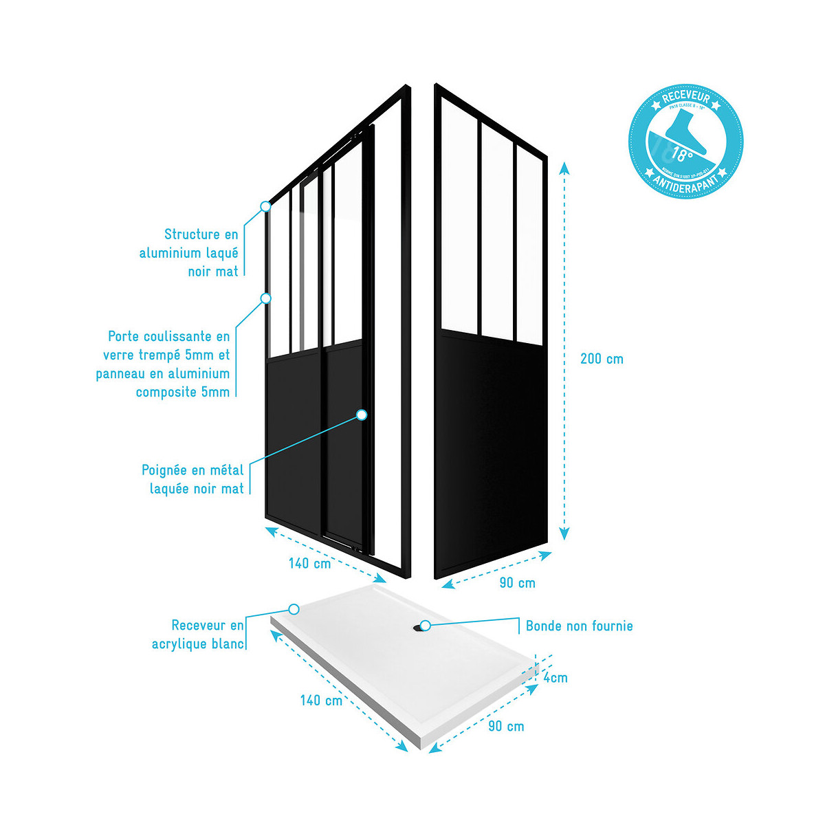 PACK FABRIK COULISSANTE 140 + RETOUR 90 + PURE 140/90 Caractéristiques des parois : Structure en aluminium laqué noir mat 1 Porte coulissante en verre trempé 5mm et panneau en aluminium composite 5mm 1 Paroi retour en verre trempé 5mm et panneau en aluminium composite 5mm Poignée en métal laquée noir mat Dimensions de la paroi coulissante : 140x200 cm Dimensions de la paroi retour : 90x200 cm Caractéristiques du receveur : Receveur en acrylique blanc 4mm d'épaisseur Dimensions 140x90 cm Référence : FAC418 Garantie 2 ans pièces et non main d'oeuvre. Profilé noir mat thermolaqué : Le thermolaquage est une technique de traitement spécifique réservé aux matériaux en métal ou en aluminium brut. On projette de la peinture en poudre chargée en électricité statique qui va se déposer sur toute la surface des profilés. Cette technique de pulvérisation en poudre , qui s’appelle projection électrostatique ou poudrage électrostatique, permet d'avoir un revêtement complètement uniforme sur tous les profilés. Ce type de traitement dispense l’utilisation de produits chimiques nocifs pour la santé et l’environnement comme les solvants. Après avoir été recouverte de poudre, la pièce doit passer dans un four où elle sera chauffée pendant 20 minutes à 200°C. Les avantages du thermolaquage : Cette technique possède de nombreux avantage, qui sont La surface peinte possède une dureté supérieure ce qui a pour conséquence une résistance aux chocs accrue Le thermolaquage a une meilleure résistance à la corrosion La couleur des profilés thermolaqués résiste mieux au vieillisement et tout autres élément tel que l'humidité etc. Les profilés thermolaqués présentent une meilleure finition, fini les coulures de peinture et défauts d'aspect, avec cette technique la surface est uniforme Sans solvant c'est un véritable plus pour la santé Mais aussi plus écologique (pas de solvants) Dans un souci de qualité mais aussi de sécurité nos produits répondent à toutes les normes Européennes en vigeur. Que ce soit en terme de sécurité en cas de casse, d'entretien de nos produits ou de la durée de vie de ces derniers, nos produits remplissent tous les critères. Verre trempé : Le verre trempé est un verre qui a subi un traitement afin d’améliorer ses propriétés. Nous utilisons la trempe thermique qui consiste à porter le verre à très haute température (environ à 700 °C), puis de le refroidir rapidement. Ce processus favorise l'apparition de tensions en profondeur et celle de la compression à la surface du verre. Tout cela a pour effet l’amélioration de sa résistance aux chocs. Il est de 2 à 5 fois plus résistant que le verre simple. Mais aussi diminue grandement la dangerosité du verre car en cas de casse le verre explose en de petits morceaux et non pas en de grands pans tranchants. Pour le reste il conserve les mêmes propriétés que le verre classique Norme harmonisée : EN14428:2004 Certification Européenne: Aptitude au nettoyage : EN14428 :2004+A1:2008 Clause 4.2 Résistance à l’impact / Propriétés d’éclatement: EN14428:2004+A1:2008 Clause 4.3 Durabilité : EN14428:2004+A1:2008 Clause 4.4 MyShowerRoom c’est aussi la garantie de durabilité : Nous garantissons un stock de pièces détachées d’au moins 5 ans Notre visserie est en acier inoxydable ce qui est une garantie anticorrosion Garantie 2 ans pièces uniquement Cocorico ! MyShowerRoom est une entreprise Française et toute la conception de nos produits est également Française. Ce qui est un véritable plus pour être au plus près de ses clients et avoir une meilleure connaissance de leurs attentes. Qui sommes nous L’HISTOIRE DE MYSHOWERROOM Nous avons créé MyShowerRoom en 2003 avec l’ambition de démocratiser le design et l’innovation dans la salle de bain pour faire de cette pièce un lieu à part entière, un véritable lieu d’histoires à vivre pour toute la famille. Nos cabines de douche et meubles de salle de bain dans l’ère du temps à des tarifs très accessibles. Nos nombreux brevets garantissent l’originalité de notre gamme de cabines de douches. Et nos ingénieurs mettent en œuvre tout leur savoir-faire et toutes les technologies innovantes au service d’une simplicité d’installation et d’utilisation incomparable pour tous. ÊTRE BIENVEILLANT AVEC NOS CLIENTS Notre service client a un objectif : rendre nos clients heureux. Pour cela nous veillons à répondre dans les 24h aux demandes clients. Mais aussi de toujours apporter une solution et entière satisfaction à nos clients. CONSTRUIRE DES PRODUITS TOUJOURS PLUS PERFORMANTS Nos ingénieurs, ainsi que nos équipes terrain consacrent tous leurs efforts à créer des produits adaptés à vos besoins, et toujours plus innovants grâce à nos technologies. Notre objectif est d’être votre unique interlocuteur pour tous vos projets de salle de bain. CONCRÉTISER LES RÊVES DE CHACUN Un projet de salle de bain ? Nous le réalisons ! Lieu de détente et de relaxation par excellence, la salle de bain est une des pièces maîtresse de la maison. Chez MyShowerRoom, nous mettons tout en oeuvre afin que ce rêve devienne réalité. PROPOSER UNE GAMME COMPLÈTE DE PRODUITS Nous vous proposons grâce à notre boutique en ligne une gamme complète de produits Made in MyShowerRoom pour équiper, et accessoiriser votre salle de bain. Un catalogue que nous renouvelons régulièrement avec les dernières technologies MyShowerRoom. APPORTER UNE EXPERTISE HUMAINE Parce que l’humain passe avant tout, nous travaillons avec les meilleurs experts. La satisfaction de nos clients est notre seule et unique priorité. Chaque problème a une solution, et c’est dans cette optique que nous avons mis en place un chat pour échanger directement avec nos équipes. NOTRE CENTRE LOGISTIQUE 11 000 m² d’entrepôt 7000 palettes en stock 1 800 colis traités par jour Plus de 260 préparations de commandes qu