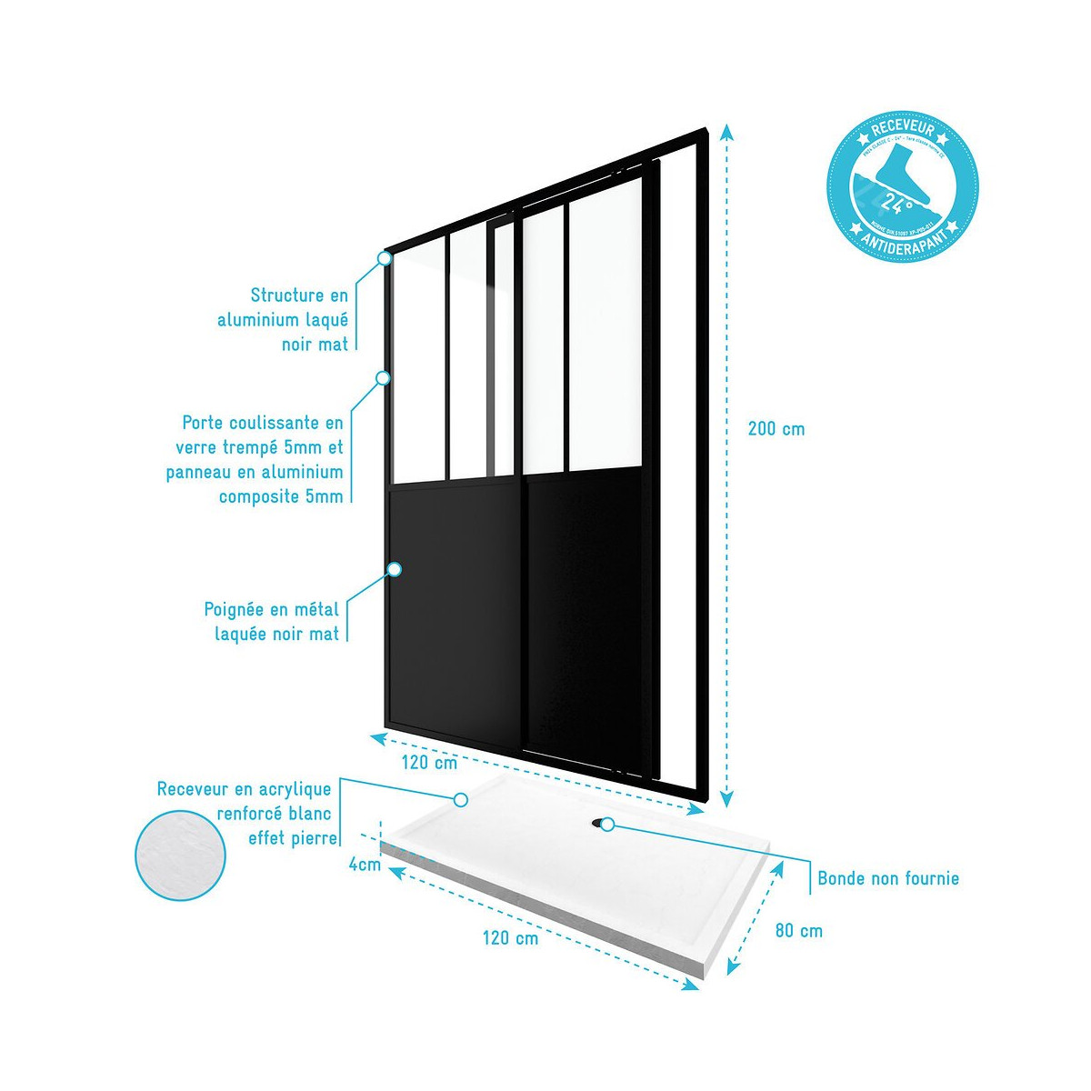 Pack comprenant une Paroi de douche à porte coulissante type atelier WORKSHOP SLIDING 120 + receveur en acrylique renforcée blanc effet pierre MOON RECTANGULAR 120/80 Caractéristiques de la paroi WORKSHOP SLIDE 120: Paroi de douche à porte coulissante de type atelier Structure en aluminium laqué noir mat Profilés de fixation murale ajustables (+ / - 1cm) Porte coulissante type atelier avec une partie en verre trempé 5 mm sur le haut et une partie en aluminium composite de 5mm Poignée en métal laquée noir mat Fermeture magnétique Montage réversible Dimensions: 120x200 cm Référence: FAC352 Caractéristiques MOON RECTANGULAR 80 Receveur rectangle en acrylique renforcée blanc effet pierre À poser ou à encastrer dans le sol Surface anti-dérapante Faible épaisseur : 4 cm Bonde 90mm non fournie Dimensions 120x80x4cm Les plus produit: Receveur en acrylique renforcée ultra résistant et imputrescible Superbe finition effet pierre Installation facile Référence: FAC366 Désignation du produit: WORKSHOP SLIDING 120 + MOON RECTANGULAR 120/80 Garantie 2 ans pièces et non main d'oeuvre. Profilé noir mat thermolaqué : Le thermolaquage est une technique de traitement spécifique réservé aux matériaux en métal ou en aluminium brut. On projette de la peinture en poudre chargée en électricité statique qui va se déposer sur toute la surface des profilés. Cette technique de pulvérisation en poudre , qui s’appelle projection électrostatique ou poudrage électrostatique, permet d'avoir un revêtement complètement uniforme sur tous les profilés. Ce type de traitement dispense l’utilisation de produits chimiques nocifs pour la santé et l’environnement comme les solvants. Après avoir été recouverte de poudre, la pièce doit passer dans un four où elle sera chauffée pendant 20 minutes à 200°C. Les avantages du thermolaquage : Cette technique possède de nombreux avantage, qui sont La surface peinte possède une dureté supérieure ce qui a pour conséquence une résistance aux chocs accrue Le thermolaquage a une meilleure résistance à la corrosion La couleur des profilés thermolaqués résiste mieux au vieillisement et tout autres élément tel que l'humidité etc. Les profilés thermolaqués présentent une meilleure finition, fini les coulures de peinture et défauts d'aspect, avec cette technique la surface est uniforme Sans solvant c'est un véritable plus pour la santé Mais aussi plus écologique (pas de solvants) Dans un souci de qualité mais aussi de sécurité nos produits répondent à toutes les normes Européennes en vigeur. Que ce soit en terme de sécurité en cas de casse, d'entretien de nos produits ou de la durée de vie de ces derniers, nos produits remplissent tous les critères. Verre trempé : Le verre trempé est un verre qui a subi un traitement afin d’améliorer ses propriétés. Nous utilisons la trempe thermique qui consiste à porter le verre à très haute température (environ à 700 °C), puis de le refroidir rapidement. Ce processus favorise l'apparition de tensions en profondeur et celle de la compression à la surface du verre. Tout cela a pour effet l’amélioration de sa résistance aux chocs. Il est de 2 à 5 fois plus résistant que le verre simple. Mais aussi diminue grandement la dangerosité du verre car en cas de casse le verre explose en de petits morceaux et non pas en de grands pans tranchants. Pour le reste il conserve les mêmes propriétés que le verre classique Norme harmonisée : EN14428:2004 Certification Européenne: Aptitude au nettoyage : EN14428 :2004+A1:2008 Clause 4.2 Résistance à l’impact / Propriétés d’éclatement: EN14428:2004+A1:2008 Clause 4.3 Durabilité : EN14428:2004+A1:2008 Clause 4.4 MyShowerRoom c’est aussi la garantie de durabilité : Nous garantissons un stocks de pièces détachées d’au moins 5 ans Notre visserie est en acier inoxydable ce qui est une garantie anticorrosion Garantie 2 ans pièces uniquement Cocorico ! MyShowerRoom est une entreprise Française et toute la conception de nos produits est également Française. Ce qui est un véritable plus pour être au plus près de ses clients et avoir une meilleure connaissance de leurs attentes. Qui sommes nous L’HISTOIRE DE MYSHOWERROOM Nous avons créé MyShowerRoom en 2003 avec l’ambition de démocratiser le design et l’innovation dans la salle de bain pour faire de cette pièce un lieu à part entière, un véritable lieu d’histoires à vivre pour toute la famille. Nos cabines de douche et meubles de salle de bain dans l’ère du temps à des tarifs très accessibles. Nos nombreux brevets garantissent l’originalité de notre gamme de cabines de douches. Et nos ingénieurs mettent en œuvre tout leur savoir-faire et toutes les technologies innovantes au service d’une simplicité d’installation et d’utilisation incomparable pour tous. ÊTRE BIENVEILLANT AVEC NOS CLIENTS Notre service client a un objectif : rendre nos clients heureux. Pour cela nous veillons à répondre dans les 24h aux demandes clients. Mais aussi de toujours apporter une solution et entière satisfaction à nos clients. CONSTRUIRE DES PRODUITS TOUJOURS PLUS PERFORMANTS Nos ingénieurs, ainsi que nos équipes terrain consacrent tous leurs efforts à créer des produits adaptés à vos besoins, et toujours plus innovants grâce à nos technologies. Notre objectif est d’être votre unique interlocuteur pour tous vos projets de salle de bain. CONCRÉTISER LES RÊVES DE CHACUN Un projet de salle de bain ? Nous le réalisons ! Lieu de détente et de relaxation par excellence, la salle de bain est une des pièces maîtresse de la maison. Chez MyShowerRoom, nous mettons tout en oeuvre afin que ce rêve devienne réalité. PROPOSER UNE GAMME COMPLÈTE DE PRODUITS Nous vous proposons grâce à notre boutique en ligne une gamme complète de produits Made in MyShowerRoom pour équiper, et accessoiriser votre salle de bain. Un catalogue que nous 