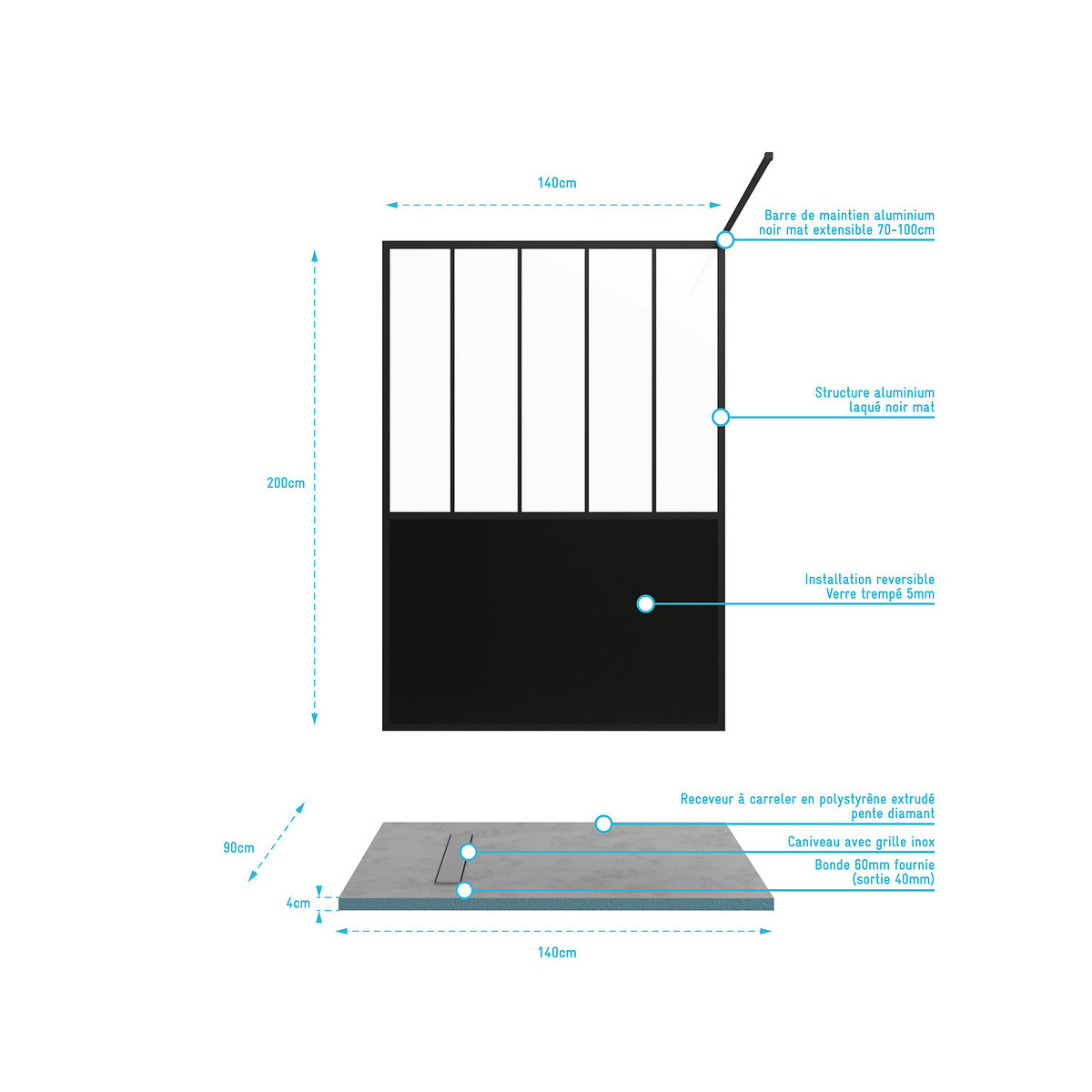 Caractéristiques de la paroi : Barre de maintien en aluminium noir mat extensible 70-100cm Structure en aluminium laqué noir mat Installation réversible Verre trempé ép. 5mm Dimensions 140x200 cm Caractéristiques Receveur à carreler en polystyrène extrudé étanche avec caniveau intégré et pente diamant Facile à installer grâce à la bague à visser Grille inox Sortie en diamètre 40mm Découpable pour montage sur mesure Livré avec bonde de 60mm Dimensions 90x140x4cm Réference du produit: PACF076 Désignation produit : GLASSY 140 + RAINY LINEAR 140 Garantie 2 ans pièces et non main d'oeuvre. Profilé noir mat thermolaqué : Le thermolaquage est une technique de traitement spécifique réservé aux matériaux en métal ou en aluminium brut. On projette de la peinture en poudre chargée en électricité statique qui va se déposer sur toute la surface des profilés. Cette technique de pulvérisation en poudre , qui s’appelle projection électrostatique ou poudrage électrostatique, permet d'avoir un revêtement complètement uniforme sur tous les profilés. Ce type de traitement dispense l’utilisation de produits chimiques nocifs pour la santé et l’environnement comme les solvants. Après avoir été recouverte de poudre, la pièce doit passer dans un four où elle sera chauffée pendant 20 minutes à 200°C. Les avantages du thermolaquage : Cette technique possède de nombreux avantage, qui sont La surface peinte possède une dureté supérieure ce qui a pour conséquence une résistance aux chocs accrue Le thermolaquage a une meilleure résistance à la corrosion La couleur des profilés thermolaqués résiste mieux au vieillisement et tout autres élément tel que l'humidité etc. Les profilés thermolaqués présentent une meilleure finition, fini les coulures de peinture et défauts d'aspect, avec cette technique la surface est uniforme Sans solvant c'est un véritable plus pour la santé Mais aussi plus écologique (pas de solvants) Dans un souci de qualité mais aussi de sécurité nos produits répondent à toutes les normes Européennes en vigeur. Que ce soit en terme de sécurité en cas de casse, d'entretien de nos produits ou de la durée de vie de ces derniers, nos produits remplissent tous les critères. Verre trempé : Le verre trempé est un verre qui a subi un traitement afin d’améliorer ses propriétés. Nous utilisons la trempe thermique qui consiste à porter le verre à très haute température (environ à 700 °C), puis de le refroidir rapidement. Ce processus favorise l'apparition de tensions en profondeur et celle de la compression à la surface du verre. Tout cela a pour effet l’amélioration de sa résistance aux chocs. Il est de 2 à 5 fois plus résistant que le verre simple. Mais aussi diminue grandement la dangerosité du verre car en cas de casse le verre explose en de petits morceaux et non pas en de grands pans tranchants. Pour le reste il conserve les mêmes propriétés que le verre classique Norme harmonisée : EN14428:2004 Certification Européenne: Aptitude au nettoyage : EN14428 :2004+A1:2008 Clause 4.2 Résistance à l’impact / Propriétés d’éclatement: EN14428:2004+A1:2008 Clause 4.3 Durabilité : EN14428:2004+A1:2008 Clause 4.4 MyShowerRoom c’est aussi la garantie de durabilité : Nous garantissons un stocks de pièces détachées d’au moins 5 ans Notre visserie est en acier inoxydable ce qui est une garantie anticorrosion Garantie 2 ans pièces uniquement Cocorico ! MyShowerRoom est une entreprise Française et toute la conception de nos produits est également Française. Ce qui est un véritable plus pour être au plus près de ses clients et avoir une meilleure connaissance de leurs attentes. Qui sommes nous L’HISTOIRE DE MYSHOWERROOM Nous avons créé MyShowerRoom en 2003 avec l’ambition de démocratiser le design et l’innovation dans la salle de bain pour faire de cette pièce un lieu à part entière, un véritable lieu d’histoires à vivre pour toute la famille. Nos cabines de douche et meubles de salle de bain dans l’ère du temps à des tarifs très accessibles. Nos nombreux brevets garantissent l’originalité de notre gamme de cabines de douches. Et nos ingénieurs mettent en œuvre tout leur savoir-faire et toutes les technologies innovantes au service d’une simplicité d’installation et d’utilisation incomparable pour tous. ÊTRE BIENVEILLANT AVEC NOS CLIENTS Notre service client a un objectif : rendre nos clients heureux. Pour cela nous veillons à répondre dans les 24h aux demandes clients. Mais aussi de toujours apporter une solution et entière satisfaction à nos clients. CONSTRUIRE DES PRODUITS TOUJOURS PLUS PERFORMANTS Nos ingénieurs, ainsi que nos équipes terrain consacrent tous leurs efforts à créer des produits adaptés à vos besoins, et toujours plus innovants grâce à nos technologies. Notre objectif est d’être votre unique interlocuteur pour tous vos projets de salle de bain. CONCRÉTISER LES RÊVES DE CHACUN Un projet de salle de bain ? Nous le réalisons ! Lieu de détente et de relaxation par excellence, la salle de bain est une des pièces maîtresse de la maison. Chez MyShowerRoom, nous mettons tout en oeuvre afin que ce rêve devienne réalité. PROPOSER UNE GAMME COMPLÈTE DE PRODUITS Nous vous proposons grâce à notre boutique en ligne une gamme complète de produits Made in MyShowerRoom pour équiper, et accessoiriser votre salle de bain. Un catalogue que nous renouvelons régulièrement avec les dernières technologies MyShowerRoom. APPORTER UNE EXPERTISE HUMAINE Parce que l’humain passe avant tout, nous travaillons avec les meilleurs experts. La satisfaction de nos clients est notre seule et unique priorité. Chaque problème a une solution, et c’est dans cette optique que nous avons mis en place un chat pour échanger directement avec nos équipes. NOTRE CENTRE LOGISTIQUE 11 000 m² d’entrepôt 7000 palettes en stock 1 800 colis traités pa