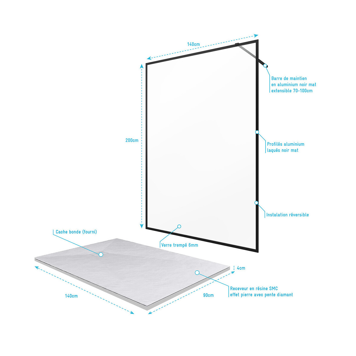 PACK PAROI CONTOURING 140 + RECEVEUR à poser ROCK 2 WHITE 140-90 Caractéristiques de la paroi : Verre trempé transparent 6mm Profilés aluminium laqués noir mat Barre de maintien en aluminium noir mat extensible 70-100cm Installation réversible Dimensions : 140x200cm Caractéristiques du receveur : Receveur en résine SMC effet pierre Pente diamant Épaisseur 4mm Cache bonde fourni Bonde 90mm non fournie Dimensions 140x90cm Référence : PACF011 Désignation du produit: PACK PAROI CONTOURING 140 + RECEVEUR à poser ROCK 2 WHITE 140-90 Garantie 2 ans pièces et non main d'oeuvre. Profilé noir mat thermolaqué : Le thermolaquage est une technique de traitement spécifique réservé aux matériaux en métal ou en aluminium brut. On projette de la peinture en poudre chargée en électricité statique qui va se déposer sur toute la surface des profilés. Cette technique de pulvérisation en poudre , qui s’appelle projection électrostatique ou poudrage électrostatique, permet d'avoir un revêtement complètement uniforme sur tous les profilés. Ce type de traitement dispense l’utilisation de produits chimiques nocifs pour la santé et l’environnement comme les solvants. Après avoir été recouverte de poudre, la pièce doit passer dans un four où elle sera chauffée pendant 20 minutes à 200°C. Les avantages du thermolaquage : Cette technique possède de nombreux avantage, qui sont La surface peinte possède une dureté supérieure ce qui a pour conséquence une résistance aux chocs accrue Le thermolaquage a une meilleure résistance à la corrosion La couleur des profilés thermolaqués résiste mieux au vieillisement et tout autres élément tel que l'humidité etc. Les profilés thermolaqués présentent une meilleure finition, fini les coulures de peinture et défauts d'aspect, avec cette technique la surface est uniforme Sans solvant c'est un véritable plus pour la santé Mais aussi plus écologique (pas de solvants) Dans un souci de qualité mais aussi de sécurité nos produits répondent à toutes les normes Européennes en vigeur. Que ce soit en terme de sécurité en cas de casse, d'entretien de nos produits ou de la durée de vie de ces derniers, nos produits remplissent tous les critères. Verre trempé : Le verre trempé est un verre qui a subi un traitement afin d’améliorer ses propriétés. Nous utilisons la trempe thermique qui consiste à porter le verre à très haute température (environ à 700 °C), puis de le refroidir rapidement. Ce processus favorise l'apparition de tensions en profondeur et celle de la compression à la surface du verre. Tout cela a pour effet l’amélioration de sa résistance aux chocs. Il est de 2 à 5 fois plus résistant que le verre simple. Mais aussi diminue grandement la dangerosité du verre car en cas de casse le verre explose en de petits morceaux et non pas en de grands pans tranchants. Pour le reste il conserve les mêmes propriétés que le verre classique Norme harmonisée : EN14428:2004 Certification Européenne: Aptitude au nettoyage : EN14428 :2004+A1:2008 Clause 4.2 Résistance à l’impact / Propriétés d’éclatement: EN14428:2004+A1:2008 Clause 4.3 Durabilité : EN14428:2004+A1:2008 Clause 4.4 MyShowerRoom c’est aussi la garantie de durabilité : Nous garantissons un stocks de pièces détachées d’au moins 5 ans Notre visserie est en acier inoxydable ce qui est une garantie anticorrosion Garantie 2 ans pièces uniquement Cocorico ! MyShowerRoom est une entreprise Française et toute la conception de nos produits est également Française. Ce qui est un véritable plus pour être au plus près de ses clients et avoir une meilleure connaissance de leurs attentes. Qui sommes nous L’HISTOIRE DE MYSHOWERROOM Nous avons créé MyShowerRoom en 2003 avec l’ambition de démocratiser le design et l’innovation dans la salle de bain pour faire de cette pièce un lieu à part entière, un véritable lieu d’histoires à vivre pour toute la famille. Nos cabines de douche et meubles de salle de bain dans l’ère du temps à des tarifs très accessibles. Nos nombreux brevets garantissent l’originalité de notre gamme de cabines de douches. Et nos ingénieurs mettent en œuvre tout leur savoir-faire et toutes les technologies innovantes au service d’une simplicité d’installation et d’utilisation incomparable pour tous. ÊTRE BIENVEILLANT AVEC NOS CLIENTS Notre service client a un objectif : rendre nos clients heureux. Pour cela nous veillons à répondre dans les 24h aux demandes clients. Mais aussi de toujours apporter une solution et entière satisfaction à nos clients. CONSTRUIRE DES PRODUITS TOUJOURS PLUS PERFORMANTS Nos ingénieurs, ainsi que nos équipes terrain consacrent tous leurs efforts à créer des produits adaptés à vos besoins, et toujours plus innovants grâce à nos technologies. Notre objectif est d’être votre unique interlocuteur pour tous vos projets de salle de bain. CONCRÉTISER LES RÊVES DE CHACUN Un projet de salle de bain ? Nous le réalisons ! Lieu de détente et de relaxation par excellence, la salle de bain est une des pièces maîtresse de la maison. Chez MyShowerRoom, nous mettons tout en oeuvre afin que ce rêve devienne réalité. PROPOSER UNE GAMME COMPLÈTE DE PRODUITS Nous vous proposons grâce à notre boutique en ligne une gamme complète de produits Made in MyShowerRoom pour équiper, et accessoiriser votre salle de bain. Un catalogue que nous renouvelons régulièrement avec les dernières technologies MyShowerRoom. APPORTER UNE EXPERTISE HUMAINE Parce que l’humain passe avant tout, nous travaillons avec les meilleurs experts. La satisfaction de nos clients est notre seule et unique priorité. Chaque problème a une solution, et c’est dans cette optique que nous avons mis en place un chat pour échanger directement avec nos équipes. NOTRE CENTRE LOGISTIQUE 11 000 m² d’entrepôt 7000 palettes en stock 1 800 colis traités par jour Plus de 260 pré