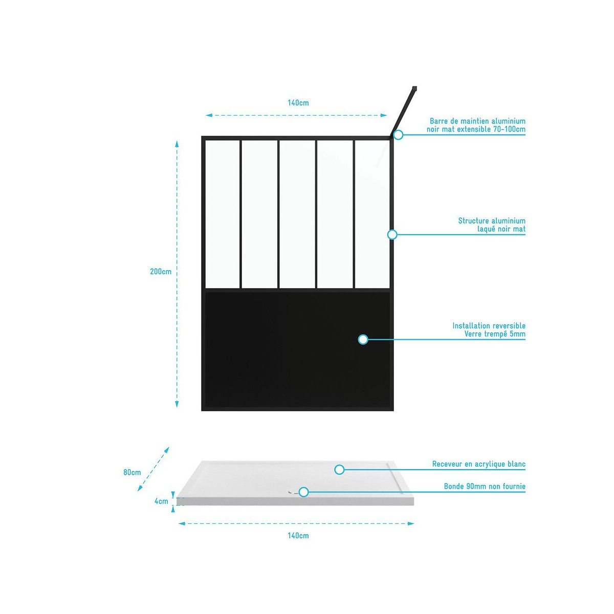 Caractéristiques de la paroi : Barre de maintien en aluminium noir mat extensible 70-100cm Structure en aluminium laqué noir mat Installation réversible Verre trempé ép. 5mm Dimensions 140x200 cm Caractéristique du receveur : Receveur en acrylique blanc Faible épaisseur : 4 cm À poser ou à encastrer dans le sol bonde 90 mm non fournie Dimensions du receveur : 140x80x4cm Réference du produit: PACF058 Désignation du produit: GLASSY 140 + WHITENESS II 140 Garantie 2 ans pièces et non main d'oeuvre. Profilé noir mat thermolaqué : Le thermolaquage est une technique de traitement spécifique réservé aux matériaux en métal ou en aluminium brut. On projette de la peinture en poudre chargée en électricité statique qui va se déposer sur toute la surface des profilés. Cette technique de pulvérisation en poudre , qui s’appelle projection électrostatique ou poudrage électrostatique, permet d'avoir un revêtement complètement uniforme sur tous les profilés. Ce type de traitement dispense l’utilisation de produits chimiques nocifs pour la santé et l’environnement comme les solvants. Après avoir été recouverte de poudre, la pièce doit passer dans un four où elle sera chauffée pendant 20 minutes à 200°C. Les avantages du thermolaquage : Cette technique possède de nombreux avantage, qui sont La surface peinte possède une dureté supérieure ce qui a pour conséquence une résistance aux chocs accrue Le thermolaquage a une meilleure résistance à la corrosion La couleur des profilés thermolaqués résiste mieux au vieillisement et tout autres élément tel que l'humidité etc. Les profilés thermolaqués présentent une meilleure finition, fini les coulures de peinture et défauts d'aspect, avec cette technique la surface est uniforme Sans solvant c'est un véritable plus pour la santé Mais aussi plus écologique (pas de solvants) Dans un souci de qualité mais aussi de sécurité nos produits répondent à toutes les normes Européennes en vigeur. Que ce soit en terme de sécurité en cas de casse, d'entretien de nos produits ou de la durée de vie de ces derniers, nos produits remplissent tous les critères. Verre trempé : Le verre trempé est un verre qui a subi un traitement afin d’améliorer ses propriétés. Nous utilisons la trempe thermique qui consiste à porter le verre à très haute température (environ à 700 °C), puis de le refroidir rapidement. Ce processus favorise l'apparition de tensions en profondeur et celle de la compression à la surface du verre. Tout cela a pour effet l’amélioration de sa résistance aux chocs. Il est de 2 à 5 fois plus résistant que le verre simple. Mais aussi diminue grandement la dangerosité du verre car en cas de casse le verre explose en de petits morceaux et non pas en de grands pans tranchants. Pour le reste il conserve les mêmes propriétés que le verre classique Norme harmonisée : EN14428:2004 Certification Européenne: Aptitude au nettoyage : EN14428 :2004+A1:2008 Clause 4.2 Résistance à l’impact / Propriétés d’éclatement: EN14428:2004+A1:2008 Clause 4.3 Durabilité : EN14428:2004+A1:2008 Clause 4.4 MyShowerRoom c’est aussi la garantie de durabilité : Nous garantissons un stocks de pièces détachées d’au moins 5 ans Notre visserie est en acier inoxydable ce qui est une garantie anticorrosion Garantie 2 ans pièces uniquement Cocorico ! MyShowerRoom est une entreprise Française et toute la conception de nos produits est également Française. Ce qui est un véritable plus pour être au plus près de ses clients et avoir une meilleure connaissance de leurs attentes. Qui sommes nous L’HISTOIRE DE MYSHOWERROOM Nous avons créé MyShowerRoom en 2003 avec l’ambition de démocratiser le design et l’innovation dans la salle de bain pour faire de cette pièce un lieu à part entière, un véritable lieu d’histoires à vivre pour toute la famille. Nos cabines de douche et meubles de salle de bain dans l’ère du temps à des tarifs très accessibles. Nos nombreux brevets garantissent l’originalité de notre gamme de cabines de douches. Et nos ingénieurs mettent en œuvre tout leur savoir-faire et toutes les technologies innovantes au service d’une simplicité d’installation et d’utilisation incomparable pour tous. ÊTRE BIENVEILLANT AVEC NOS CLIENTS Notre service client a un objectif : rendre nos clients heureux. Pour cela nous veillons à répondre dans les 24h aux demandes clients. Mais aussi de toujours apporter une solution et entière satisfaction à nos clients. CONSTRUIRE DES PRODUITS TOUJOURS PLUS PERFORMANTS Nos ingénieurs, ainsi que nos équipes terrain consacrent tous leurs efforts à créer des produits adaptés à vos besoins, et toujours plus innovants grâce à nos technologies. Notre objectif est d’être votre unique interlocuteur pour tous vos projets de salle de bain. CONCRÉTISER LES RÊVES DE CHACUN Un projet de salle de bain ? Nous le réalisons ! Lieu de détente et de relaxation par excellence, la salle de bain est une des pièces maîtresse de la maison. Chez MyShowerRoom, nous mettons tout en oeuvre afin que ce rêve devienne réalité. PROPOSER UNE GAMME COMPLÈTE DE PRODUITS Nous vous proposons grâce à notre boutique en ligne une gamme complète de produits Made in MyShowerRoom pour équiper, et accessoiriser votre salle de bain. Un catalogue que nous renouvelons régulièrement avec les dernières technologies MyShowerRoom. APPORTER UNE EXPERTISE HUMAINE Parce que l’humain passe avant tout, nous travaillons avec les meilleurs experts. La satisfaction de nos clients est notre seule et unique priorité. Chaque problème a une solution, et c’est dans cette optique que nous avons mis en place un chat pour échanger directement avec nos équipes. NOTRE CENTRE LOGISTIQUE 11 000 m² d’entrepôt 7000 palettes en stock 1 800 colis traités par jour Plus de 260 préparations de commandes quotidiennes 12 quais de chargement/déchargement CONSE