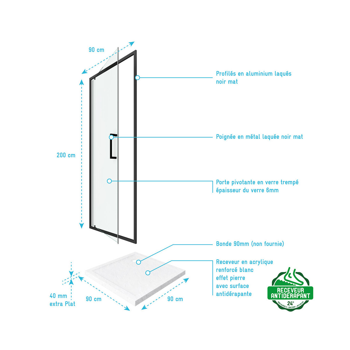 Caractéristiques Structure en aluminium laqué noir mat Profilés de fixation murale ajustables (+ / - 1 cm) Porte pivotante en verre trempé 6 mm transparent Poignée en métal laquée noir mat Fermeture magnétique Montage réversible Dimensions 90x200 cm Caractéristiques du receveur: Receveur en acrylique renforcée blanc effet pierre À poser ou à encastrer dans le sol Surface anti-dérapante Faible épaisseur : 4 cm Bonde 90mm non fournie Dimensions du receveur: 90x90x4cm Garantie 2 ans pièces et non main d'oeuvre. Profilé noir mat thermolaqué : Le thermolaquage est une technique de traitement spécifique réservé aux matériaux en métal ou en aluminium brut. On projette de la peinture en poudre chargée en électricité statique qui va se déposer sur toute la surface des profilés. Cette technique de pulvérisation en poudre , qui s’appelle projection électrostatique ou poudrage électrostatique, permet d'avoir un revêtement complètement uniforme sur tous les profilés. Ce type de traitement dispense l’utilisation de produits chimiques nocifs pour la santé et l’environnement comme les solvants. Après avoir été recouverte de poudre, la pièce doit passer dans un four où elle sera chauffée pendant 20 minutes à 200°C. Les avantages du thermolaquage : Cette technique possède de nombreux avantage, qui sont La surface peinte possède une dureté supérieure ce qui a pour conséquence une résistance aux chocs accrue Le thermolaquage a une meilleure résistance à la corrosion La couleur des profilés thermolaqués résiste mieux au vieillissement et tout autres élément tel que l'humidité etc. Les profilés thermolaqués présentent une meilleure finition, fini les coulures de peinture et défauts d'aspect, avec cette technique la surface est uniforme Sans solvant c'est un véritable plus pour la santé Mais aussi plus écologique (pas de solvants) Dans un souci de qualité mais aussi de sécurité nos produits répondent à toutes les normes Européennes en vigueur. Que ce soit en terme de sécurité en cas de casse, d'entretien de nos produits ou de la durée de vie de ces derniers, nos produits remplissent tous les critères. Verre trempé : Le verre trempé est un verre qui a subi un traitement afin d’améliorer ses propriétés. Nous utilisons la trempe thermique qui consiste à porter le verre à très haute température (environ à 700 °C), puis de le refroidir rapidement. Ce processus favorise l'apparition de tensions en profondeur et celle de la compression à la surface du verre. Tout cela a pour effet l’amélioration de sa résistance aux chocs. Il est de 2 à 5 fois plus résistant que le verre simple. Mais aussi diminue grandement la dangerosité du verre car en cas de casse le verre explose en de petits morceaux et non pas en de grands pans tranchants. Pour le reste il conserve les mêmes propriétés que le verre classique Norme harmonisée : EN14428:2004 Certification Européenne: Aptitude au nettoyage : EN14428 :2004+A1:2008 Clause 4.2 Résistance à l’impact / Propriétés d’éclatement: EN14428:2004+A1:2008 Clause 4.3 Durabilité : EN14428:2004+A1:2008 Clause 4.4 MyShowerRoom c’est aussi la garantie de durabilité : Nous garantissons un stocks de pièces détachées d’au moins 5 ans Notre visserie est en acier inoxydable ce qui est une garantie anticorrosion Garantie 2 ans pièces uniquement Cocorico ! MyShowerRoom est une entreprise Française et toute la conception de nos produits est également Française. Ce qui est un véritable plus pour être au plus près de ses clients et avoir une meilleure connaissance de leurs attentes. Qui sommes nous L’HISTOIRE DE MYSHOWERROOM Nous avons créé MyShowerRoom en 2003 avec l’ambition de démocratiser le design et l’innovation dans la salle de bain pour faire de cette pièce un lieu à part entière, un véritable lieu d’histoires à vivre pour toute la famille. Nos cabines de douche et meubles de salle de bain dans l’ère du temps à des tarifs très accessibles. Nos nombreux brevets garantissent l’originalité de notre gamme de cabines de douches. Et nos ingénieurs mettent en œuvre tout leur savoir-faire et toutes les technologies innovantes au service d’une simplicité d’installation et d’utilisation incomparable pour tous. ÊTRE BIENVEILLANT AVEC NOS CLIENTS Notre service client a un objectif : rendre nos clients heureux. Pour cela nous veillons à répondre dans les 24h aux demandes clients. Mais aussi de toujours apporter une solution et entière satisfaction à nos clients. CONSTRUIRE DES PRODUITS TOUJOURS PLUS PERFORMANTS Nos ingénieurs, ainsi que nos équipes terrain consacrent tous leurs efforts à créer des produits adaptés à vos besoins, et toujours plus innovants grâce à nos technologies. Notre objectif est d’être votre unique interlocuteur pour tous vos projets de salle de bain. CONCRÉTISER LES RÊVES DE CHACUN Un projet de salle de bain ? Nous le réalisons ! Lieu de détente et de relaxation par excellence, la salle de bain est une des pièces maîtresse de la maison. Chez MyShowerRoom, nous mettons tout en oeuvre afin que ce rêve devienne réalité. PROPOSER UNE GAMME COMPLÈTE DE PRODUITS Nous vous proposons grâce à notre boutique en ligne une gamme complète de produits Made in MyShowerRoom pour équiper, et accessoiriser votre salle de bain. Un catalogue que nous renouvelons régulièrement avec les dernières technologies MyShowerRoom. APPORTER UNE EXPERTISE HUMAINE Parce que l’humain passe avant tout, nous travaillons avec les meilleurs experts. La satisfaction de nos clients est notre seule et unique priorité. Chaque problème a une solution, et c’est dans cette optique que nous avons mis en place un chat pour échanger directement avec nos équipes. NOTRE CENTRE LOGISTIQUE 11 000 m² d’entrepôt 7000 palettes en stock 1 800 colis traités par jour Plus de 260 préparations de commandes quotidiennes 12 quais de chargement/