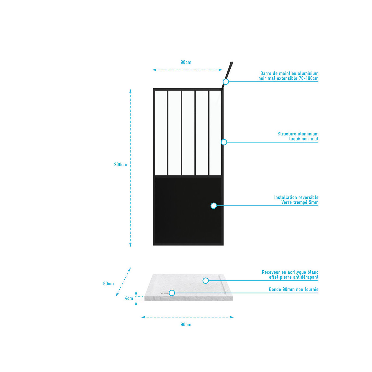 Caractéristiques de la paroi : Barre de maintien en aluminium noir mat extensible 70-100cm Structure en aluminium laqué noir mat Installation réversible Verre trempé ép. 5mm Dimensions 90x200 cm Caractéristiques Receveur en acrylique renforcée blanc effet pierre À poser ou à encastrer dans le sol Surface anti-dérapante Faible épaisseur : 4 cm Bonde 90mm non fournie Dimensions 90x90x4cm Réference du produit: PACF059 Désignation du produit: GLASSY 90 + MOON SQUARE 90 Garantie 2 ans pièces et non main d'oeuvre. Profilé noir mat thermolaqué : Le thermolaquage est une technique de traitement spécifique réservé aux matériaux en métal ou en aluminium brut. On projette de la peinture en poudre chargée en électricité statique qui va se déposer sur toute la surface des profilés. Cette technique de pulvérisation en poudre , qui s’appelle projection électrostatique ou poudrage électrostatique, permet d'avoir un revêtement complètement uniforme sur tous les profilés. Ce type de traitement dispense l’utilisation de produits chimiques nocifs pour la santé et l’environnement comme les solvants. Après avoir été recouverte de poudre, la pièce doit passer dans un four où elle sera chauffée pendant 20 minutes à 200°C. Les avantages du thermolaquage : Cette technique possède de nombreux avantage, qui sont La surface peinte possède une dureté supérieure ce qui a pour conséquence une résistance aux chocs accrue Le thermolaquage a une meilleure résistance à la corrosion La couleur des profilés thermolaqués résiste mieux au vieillisement et tout autres élément tel que l'humidité etc. Les profilés thermolaqués présentent une meilleure finition, fini les coulures de peinture et défauts d'aspect, avec cette technique la surface est uniforme Sans solvant c'est un véritable plus pour la santé Mais aussi plus écologique (pas de solvants) Dans un souci de qualité mais aussi de sécurité nos produits répondent à toutes les normes Européennes en vigeur. Que ce soit en terme de sécurité en cas de casse, d'entretien de nos produits ou de la durée de vie de ces derniers, nos produits remplissent tous les critères. Verre trempé : Le verre trempé est un verre qui a subi un traitement afin d’améliorer ses propriétés. Nous utilisons la trempe thermique qui consiste à porter le verre à très haute température (environ à 700 °C), puis de le refroidir rapidement. Ce processus favorise l'apparition de tensions en profondeur et celle de la compression à la surface du verre. Tout cela a pour effet l’amélioration de sa résistance aux chocs. Il est de 2 à 5 fois plus résistant que le verre simple. Mais aussi diminue grandement la dangerosité du verre car en cas de casse le verre explose en de petits morceaux et non pas en de grands pans tranchants. Pour le reste il conserve les mêmes propriétés que le verre classique Norme harmonisée : EN14428:2004 Certification Européenne: Aptitude au nettoyage : EN14428 :2004+A1:2008 Clause 4.2 Résistance à l’impact / Propriétés d’éclatement: EN14428:2004+A1:2008 Clause 4.3 Durabilité : EN14428:2004+A1:2008 Clause 4.4 MyShowerRoom c’est aussi la garantie de durabilité : Nous garantissons un stocks de pièces détachées d’au moins 5 ans Notre visserie est en acier inoxydable ce qui est une garantie anticorrosion Garantie 2 ans pièces uniquement Cocorico ! MyShowerRoom est une entreprise Française et toute la conception de nos produits est également Française. Ce qui est un véritable plus pour être au plus près de ses clients et avoir une meilleure connaissance de leurs attentes. Qui sommes nous L’HISTOIRE DE MYSHOWERROOM Nous avons créé MyShowerRoom en 2003 avec l’ambition de démocratiser le design et l’innovation dans la salle de bain pour faire de cette pièce un lieu à part entière, un véritable lieu d’histoires à vivre pour toute la famille. Nos cabines de douche et meubles de salle de bain dans l’ère du temps à des tarifs très accessibles. Nos nombreux brevets garantissent l’originalité de notre gamme de cabines de douches. Et nos ingénieurs mettent en œuvre tout leur savoir-faire et toutes les technologies innovantes au service d’une simplicité d’installation et d’utilisation incomparable pour tous. ÊTRE BIENVEILLANT AVEC NOS CLIENTS Notre service client a un objectif : rendre nos clients heureux. Pour cela nous veillons à répondre dans les 24h aux demandes clients. Mais aussi de toujours apporter une solution et entière satisfaction à nos clients. CONSTRUIRE DES PRODUITS TOUJOURS PLUS PERFORMANTS Nos ingénieurs, ainsi que nos équipes terrain consacrent tous leurs efforts à créer des produits adaptés à vos besoins, et toujours plus innovants grâce à nos technologies. Notre objectif est d’être votre unique interlocuteur pour tous vos projets de salle de bain. CONCRÉTISER LES RÊVES DE CHACUN Un projet de salle de bain ? Nous le réalisons ! Lieu de détente et de relaxation par excellence, la salle de bain est une des pièces maîtresse de la maison. Chez MyShowerRoom, nous mettons tout en oeuvre afin que ce rêve devienne réalité. PROPOSER UNE GAMME COMPLÈTE DE PRODUITS Nous vous proposons grâce à notre boutique en ligne une gamme complète de produits Made in MyShowerRoom pour équiper, et accessoiriser votre salle de bain. Un catalogue que nous renouvelons régulièrement avec les dernières technologies MyShowerRoom. APPORTER UNE EXPERTISE HUMAINE Parce que l’humain passe avant tout, nous travaillons avec les meilleurs experts. La satisfaction de nos clients est notre seule et unique priorité. Chaque problème a une solution, et c’est dans cette optique que nous avons mis en place un chat pour échanger directement avec nos équipes. NOTRE CENTRE LOGISTIQUE 11 000 m² d’entrepôt 7000 palettes en stock 1 800 colis traités par jour Plus de 260 préparations de commandes quotidiennes 12 quais de chargement/déc