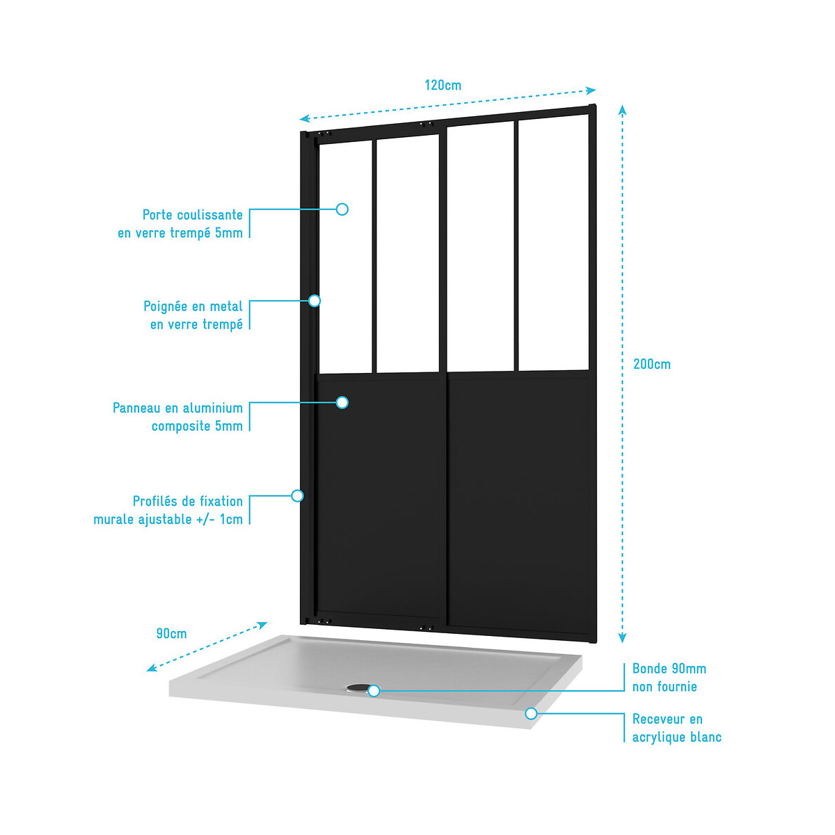PACK PAROI WORKSHOP SLIDING 120 + WHITENESS II 120-90 Caractéristiques des portes coulissantes : Porte coulissante en verre trempé 5mm Poignée en métal en verre trempé Panneau en aluminium composite 5mm Profilés de fixation murale ajustable +/- 1cm Caractéristiques du receveur : Receveur en acrylique blanc Bonde 90mm non fournie Dimensions des portes coulissantes : 120x200 cm Dimensions du receveur : 90x120 cm Référence : PACF002 Désignation produit : WORKSHOP SLIDING 120 + WHITENESS II 120-90 Garantie 2 ans pièces et non main d'oeuvre. Dans un souci de qualité mais aussi de sécurité nos produits répondent à toutes les normes Européennes en vigeur. Que ce soit en terme de sécurité en cas de casse, d'entretien de nos produits ou de la durée de vie de ces derniers, nos produits remplissent tous les critères. Profilé noir mat thermolaqué : Le thermolaquage est une technique de traitement spécifique réservé aux matériaux en métal ou en aluminium brut. On projette de la peinture en poudre chargée en électricité statique qui va se déposer sur toute la surface des profilés. Cette technique de pulvérisation en poudre , qui s’appelle projection électrostatique ou poudrage électrostatique, permet d'avoir un revêtement complètement uniforme sur tous les profilés. Ce type de traitement dispense l’utilisation de produits chimiques nocifs pour la santé et l’environnement comme les solvants. Après avoir été recouverte de poudre, la pièce doit passer dans un four où elle sera chauffée pendant 20 minutes à 200°C. Les avantages du thermolaquage : Cette technique possède de nombreux avantage, qui sont La surface peinte possède une dureté supérieure ce qui a pour conséquence une résistance aux chocs accrue Le thermolaquage a une meilleure résistance à la corrosion La couleur des profilés thermolaqués résiste mieux au vieillissement et tout autres élément tel que l'humidité etc. Les profilés thermolaqués présentent une meilleure finition, fini les coulures de peinture et défauts d'aspect, avec cette technique la surface est uniforme Sans solvant c'est un véritable plus pour la santé Mais aussi plus écologique (pas de solvants) Dans un souci de qualité mais aussi de sécurité nos produits répondent à toutes les normes Européennes en vigueur. Que ce soit en terme de sécurité en cas de casse, d'entretien de nos produits ou de la durée de vie de ces derniers, nos produits remplissent tous les critères. Verre trempé : Le verre trempé est un verre qui a subi un traitement afin d’améliorer ses propriétés. Nous utilisons la trempe thermique qui consiste à porter le verre à très haute température (environ à 700 °C), puis de le refroidir rapidement. Ce processus favorise l'apparition de tensions en profondeur et celle de la compression à la surface du verre. Tout cela a pour effet l’amélioration de sa résistance aux chocs. Il est de 2 à 5 fois plus résistant que le verre simple. Mais aussi diminue grandement la dangerosité du verre car en cas de casse le verre explose en de petits morceaux et non pas en de grands pans tranchants. Pour le reste il conserve les mêmes propriétés que le verre classique Norme harmonisée : EN14428:2004 Certification Européenne: Aptitude au nettoyage : EN14428 :2004+A1:2008 Clause 4.2 Résistance à l’impact / Propriétés d’éclatement: EN14428:2004+A1:2008 Clause 4.3 Durabilité : EN14428:2004+A1:2008 Clause 4.4 MyShowerRoom c’est aussi la garantie de durabilité : Nous garantissons un stocks de pièces détachées d’au moins 5 ans Notre visserie est en acier inoxydable ce qui est une garantie anticorrosion Garantie 2 ans pièces uniquement Cocorico ! MyShowerRoom est une entreprise Française et toute la conception de nos produits est également Française. Ce qui est un véritable plus pour être au plus près de ses clients et avoir une meilleure connaissance de leurs attentes. Qui sommes nous L’HISTOIRE DE MYSHOWERROOM Nous avons créé MyShowerRoom en 2003 avec l’ambition de démocratiser le design et l’innovation dans la salle de bain pour faire de cette pièce un lieu à part entière, un véritable lieu d’histoires à vivre pour toute la famille. Nos cabines de douche et meubles de salle de bain dans l’ère du temps à des tarifs très accessibles. Nos nombreux brevets garantissent l’originalité de notre gamme de cabines de douches. Et nos ingénieurs mettent en œuvre tout leur savoir-faire et toutes les technologies innovantes au service d’une simplicité d’installation et d’utilisation incomparable pour tous. ÊTRE BIENVEILLANT AVEC NOS CLIENTS Notre service client a un objectif : rendre nos clients heureux. Pour cela nous veillons à répondre dans les 24h aux demandes clients. Mais aussi de toujours apporter une solution et entière satisfaction à nos clients. CONSTRUIRE DES PRODUITS TOUJOURS PLUS PERFORMANTS Nos ingénieurs, ainsi que nos équipes terrain consacrent tous leurs efforts à créer des produits adaptés à vos besoins, et toujours plus innovants grâce à nos technologies. Notre objectif est d’être votre unique interlocuteur pour tous vos projets de salle de bain. CONCRÉTISER LES RÊVES DE CHACUN Un projet de salle de bain ? Nous le réalisons ! Lieu de détente et de relaxation par excellence, la salle de bain est une des pièces maîtresse de la maison. Chez MyShowerRoom, nous mettons tout en oeuvre afin que ce rêve devienne réalité. PROPOSER UNE GAMME COMPLÈTE DE PRODUITS Nous vous proposons grâce à notre boutique en ligne une gamme complète de produits Made in MyShowerRoom pour équiper, et accessoiriser votre salle de bain. Un catalogue que nous renouvelons régulièrement avec les dernières technologies MyShowerRoom. APPORTER UNE EXPERTISE HUMAINE Parce que l’humain passe avant tout, nous travaillons avec les meilleurs experts. La satisfaction de nos clients est notre seule et unique priorité. Chaque probl