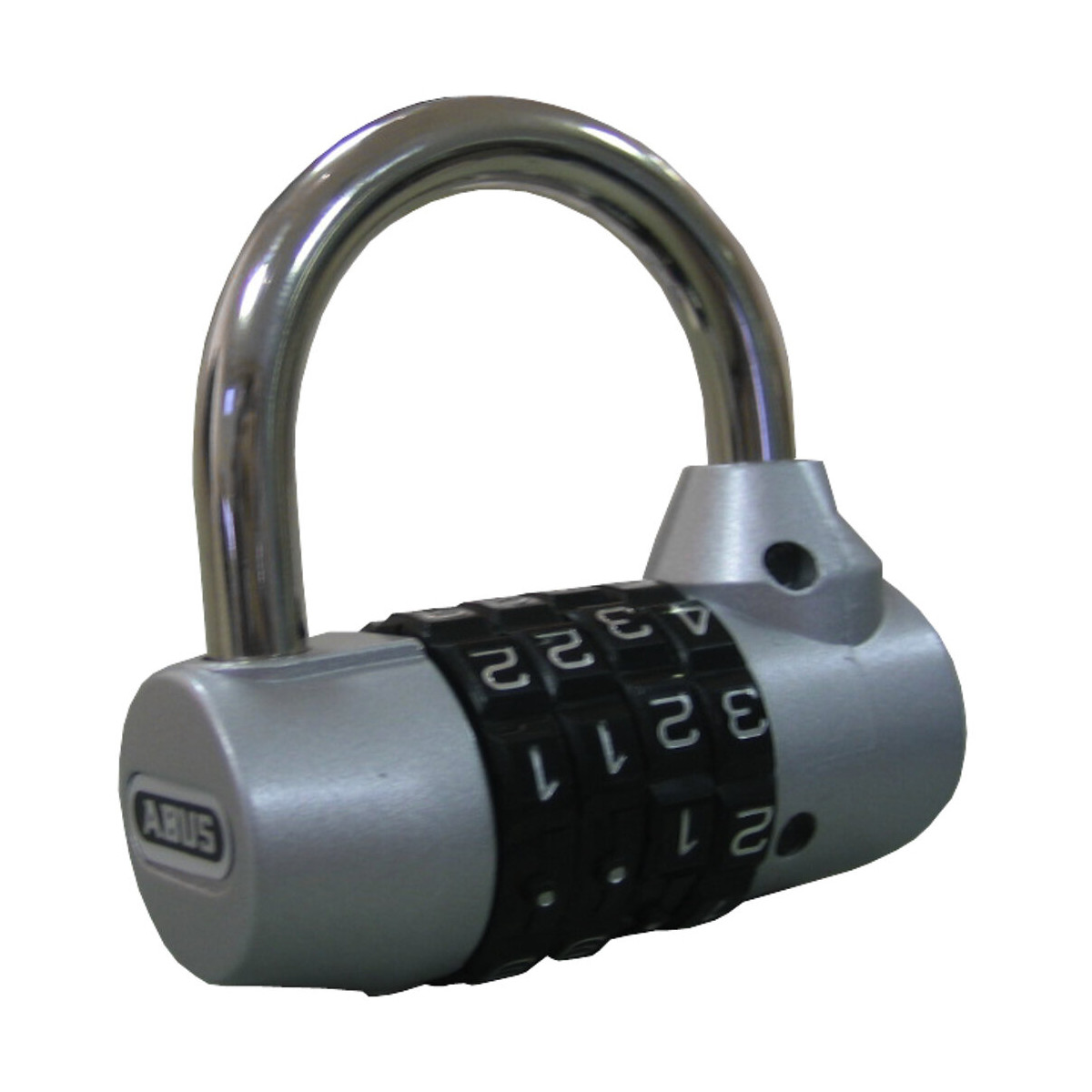 Cadenas à combinaison extérieur ABUS. Combinaison interchangeable à 4 molettes. Boitier en zamac. Anse en acier. Double verrouillage de l'anse.