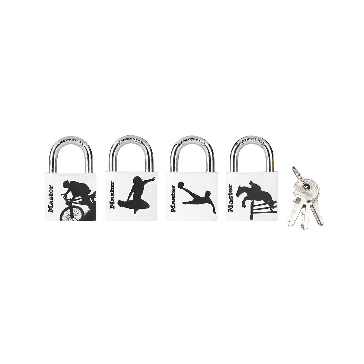 Cadenas en acier 30 mm. Anse en acier cémenté. Verrouillage à clé. Assortiment de 4 motifs ''sport'' imprimés (football, vélo, équitation, surf). Vendu en clip-strip de 6 pièces (2 pièces de football et vélo). Idéal pour casiers, rangement. Niveau de protection : intermédiaire. Poids : 110 gr. Diamètre anse haute : 5 mm. Vendu avec 4 clés.