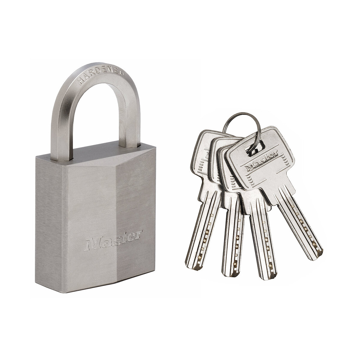 Cadenas en laiton massif nickelé 40 mm. Corps très épais. Anse hexagonale en acier cémenté nickelé. Cylindre haute sécurité 6 goupilles. Clé réversible. Idéal pour l'extérieur.Niveau de protection : haute.Poids : 300 gr.Diamètre : 7,5 mm.Anse haute : 23 mm.Vendu avec 4 clés.