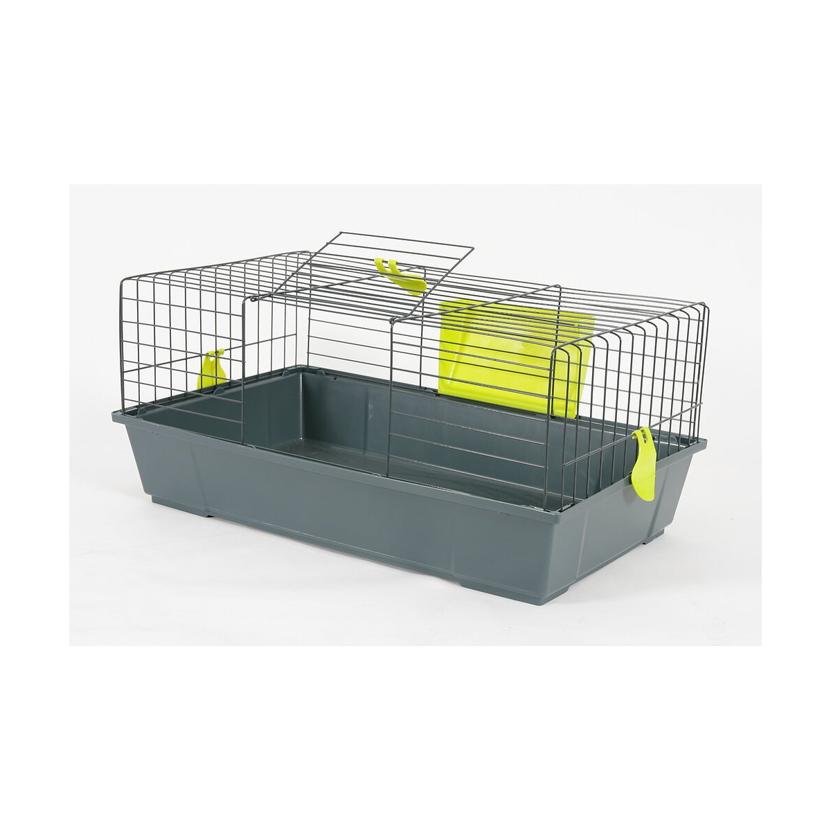 Cage Classic 80 pour lapin, cochon d'inde équipée d'un ratelier à foin. Pratique la cage dispose d'une ouverture sur le devant. Caractéristiques : Fabriquée en Europe Non toxique pour l'animal : peinture Epoxy* sans plomb et plastique polypropylène copolymère**. Diamètre des barreaux : 2,5mm Espacement entre les barreaux : 32mm Dimensions intérieures : Longueur 75 cm Profondeur 43 cm Hauteur 33cm Dimensions extérieures : Longueur 81 cm Profondeur 54 cm Hauteur 35 cm *La peinture Epoxy est une peinture à l'huile utilisée pour sa haute résistance. **Type de plastique adapté à tout contact alimentaire.Spécifications techniques