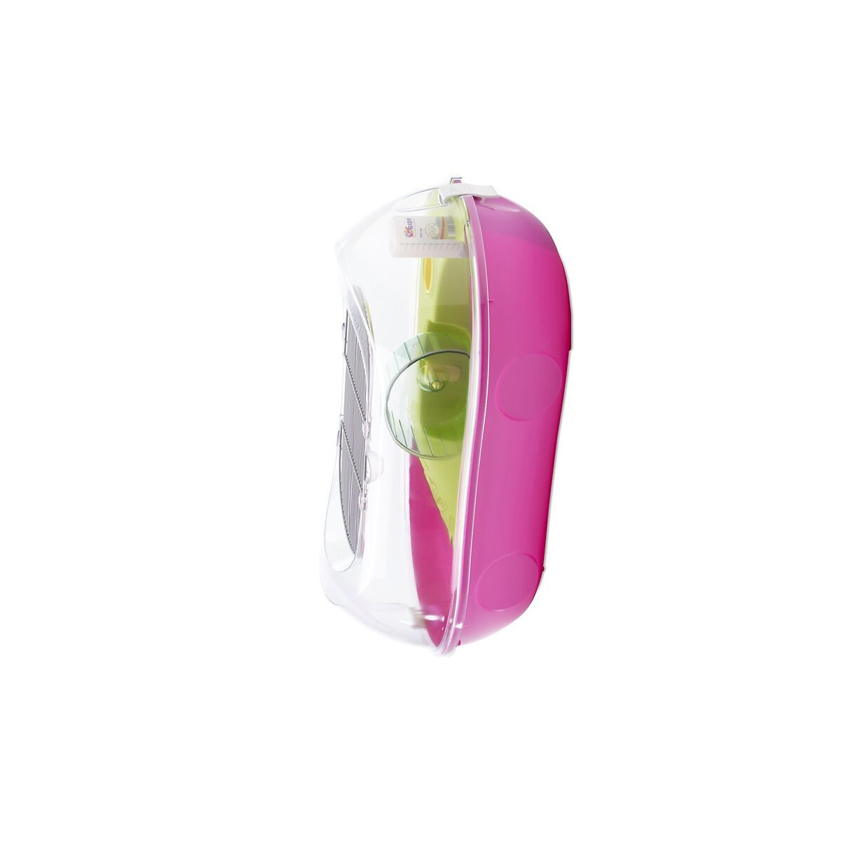 Cage élégante et contemporaine pour les souris et les hamsters nains. Les alentours de la cage au sein de la maison restent propres grâce à la partie supérieure en plastique qui retient le revêtement de sol. Avec îlot, mangeoire, biberon et roue.