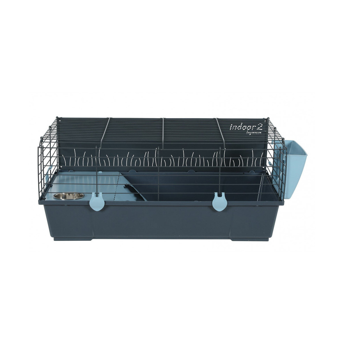 Nouvelle cage Indoor2 pour grand rongeur 80 ciel, au coloris bleu pastel avec une finition mate pour les parties en métal de la cage. Elle s'intègrera facilement dans les intérieurs actuels. Une paroi en métal plein avec découpes d'herbe et logo Indoor 2 a été prévue pour éviter les projections contre les murs. De plus, la paroi permet de mieux voir l'animal se déplacer dans son habitat. La cage comporte un râtelier à foin, une niche en métal ainsi qu'une écuelle en inox. Diamètre des barreaux 2,5mm. Espacement entre les barreaux 32mm. Dimensions extérieures de la cage : L 81 x p 54 x h 35 cm. Dimensions intérieures de la cage : L 75 x p 43 x h 33 cm. Nouvelle cage Indoor2 pour grand rongeur 80 ciel, au coloris bleu pastel avec une finition mate pour les parties en métal de la cage. Elle s'intègrera facilement dans les intérieurs actuels. Une paroi en métal plein avec découpes d'herbe et logo Indoor 2 a été prévue pour éviter les projections contre les murs. De plus, la paroi permet de mieux voir l'animal se déplacer dans son habitat. La cage comporte un râtelier à foin, une niche en métal ainsi qu'une écuelle en inox. Diamètre des barreaux 2,5mm. Espacement entre les barreaux 32mm. Dimensions extérieures de la cage : L 81 x p 54 x h 35 cm. Dimensions intérieures de la cage : L 75 x p 43 x h 33 cm. Photo non contractuelle, car il y a plusieurs vendeurs sur une même fiche produit.