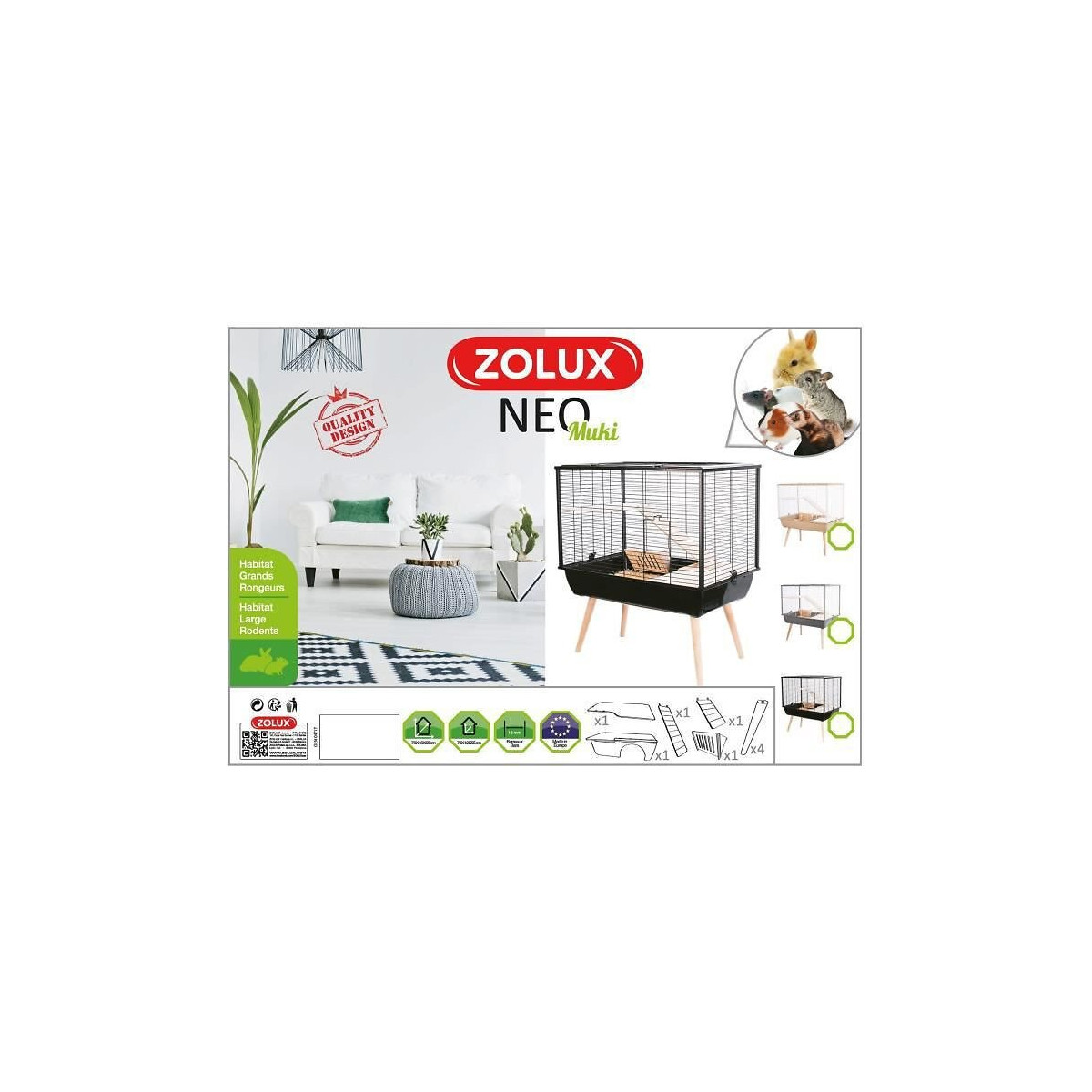 Cage Néo MUKI grise. pour grand rongeur. 77.5 x 47.5 x hauteur 87.5 cm. avec ses pieds. Cage Neo Muki pour grands rongeurs types lapins, furets, chinchillas ou encore cochons d'inde. La cage est équipée d'une niche en bois, d'un râtelier en bois, d'un étage avec rampe d'accès en bois. Cage fabriquée en Europe. Espacement des barreaux : 15mm. Dimensions extérieures (sans les pieds) : Longueur 77.5 cm x profondeur 47.5 cm x hauteur 58 cm. Dimensions extérieures (avec les pieds) : Longueur 77.5cm x profondeur 47.5 cm x hauteur 87.5 cm. Dimensions intérieures : Longueur 73 cm x profondeur 42 cm x hauteur 55 cm. Cage Néo MUKI grise. pour grand rongeur. 77.5 x 47.5 x hauteur 87.5 cm. avec ses pieds. Cage Neo Muki pour grands rongeurs types lapins, furets, chinchillas ou encore cochons d'inde. La cage est équipée d'une niche en bois, d'un râtelier en bois, d'un étage avec rampe d'accès en bois. Le système de fixation de l'étage permet d'assurer une stabilité maximum. La cage possède une grande ouverture sur le dessus et une double ouverture sur le devant pour faciliter la prise de l'animal, elle est fournie avec 4 pieds en bois massif (hêtre) permettant de surélever celle ci rappelant ainsi l'univers scandinave tendance et épuré. La surélévation de la cage ainsi que l'étage offre à l'animal une vision différente et élargie de son environnement. Cage fabriquée en Europe. Espacement des barreaux : 15mm. Dimensions extérieures (sans les pieds) : Longueur 77.5 cm x profondeur 47.5 cm x hauteur 58 cm. Dimensions extérieures (avec les pieds) : Longueur 77.5cm x profondeur 47.5 cm x hauteur 87.5 cm. Dimensions intérieures : Longueur 73 cm x profondeur 42 cm x hauteur 55 cm. Photo non contractuelle, car il y a plusieurs vendeurs sur une même fiche produit.