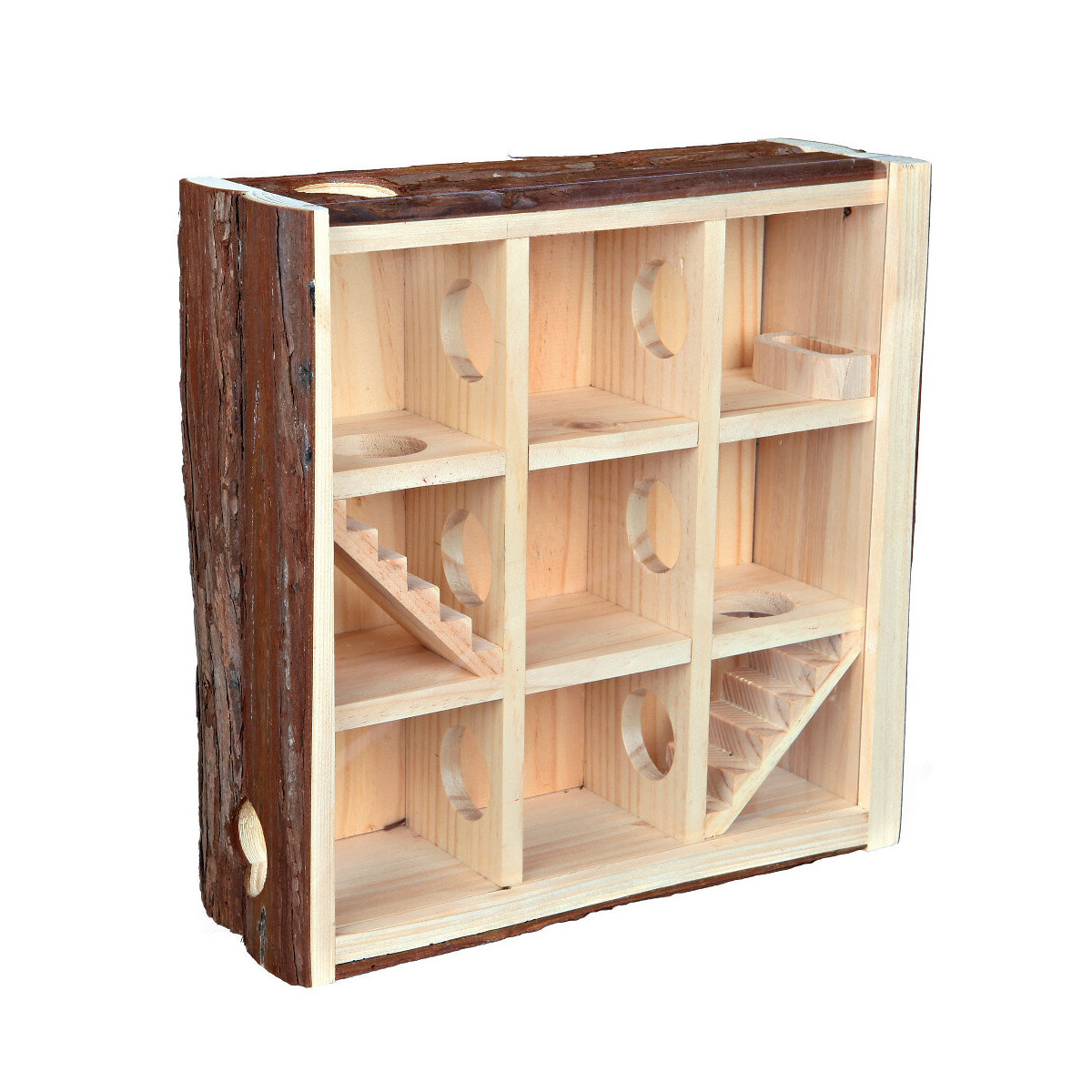 Tour de jeu en bois naturel 3 étages avec 9 pièces, 2 escaliers et écuelle avec deux entrées vitre acrylique pour observer les animaux Dimensions: 30 × 30 × 10 cm par exemple: souris, hamsters nains Photo non contractuelle, car il y a plusieurs vendeurs sur une même fiche produit.