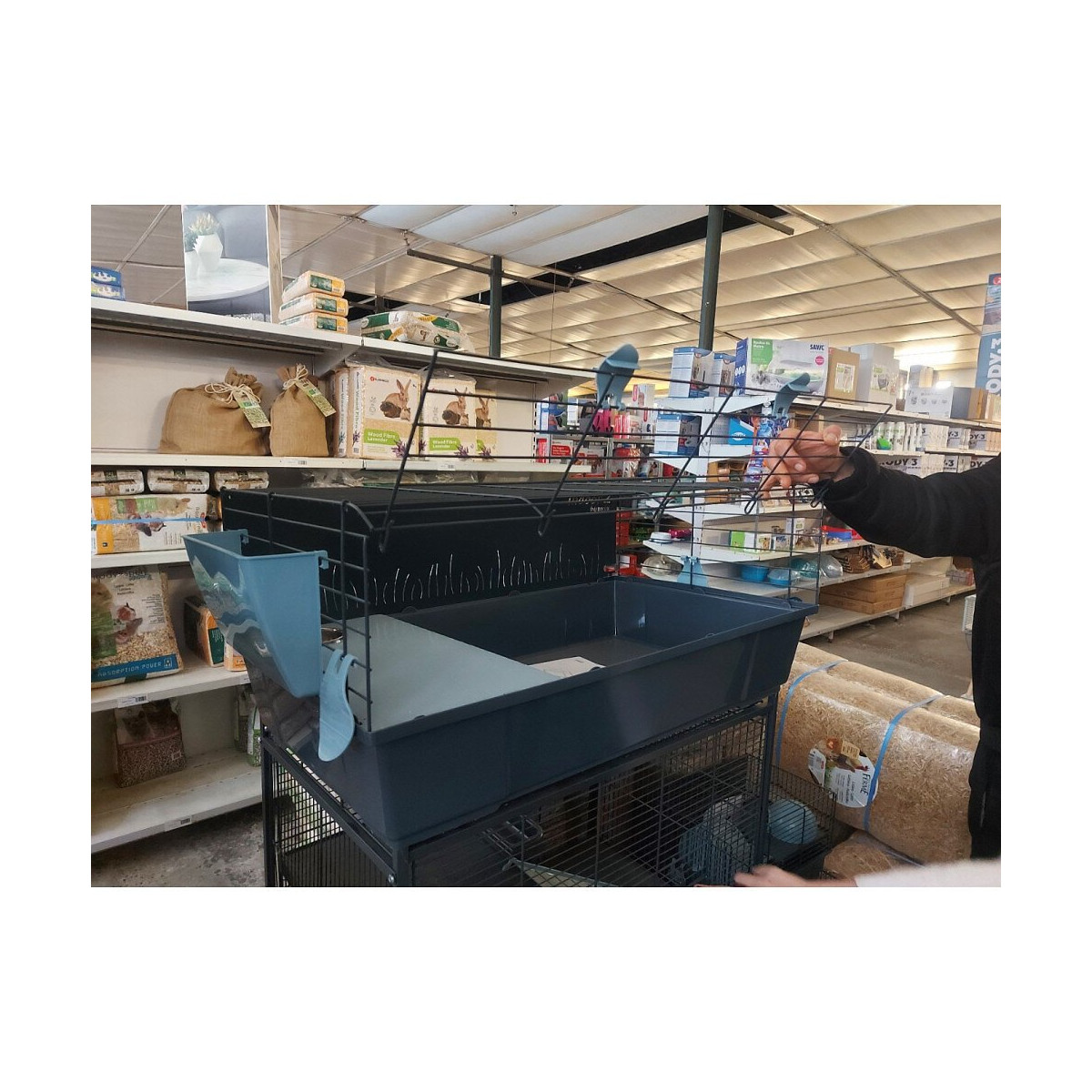 Nouvelle cage Indoor2 pour grand rongeur 120 ciel, au coloris bleu pastel avec une finition mate pour les parties en métal de la cage. Elle s'intègrera facilement dans les intérieurs actuels. Une paroi en métal plein avec découpes d'herbe et logo Indoor 2 a été prévue pour éviter les projections contre les murs. De plus, la paroi permet de mieux voir l'animal se déplacer dans son habitat. La cage comporte un râtelier à foin, une niche en métal ainsi qu'une écuelle en inox. Diamètre des barreaux 2,5mm. Espacement entre les barreaux 31 mm. Dimensions extérieures de la cage : L 123 x p 67 x h 39 cm. Dimensions intérieures de la cage : L 118 x p 55,5 x h 38 cm. Nouvelle cage Indoor2 pour grand rongeur 120 ciel, au coloris bleu pastel avec une finition mate pour les parties en métal de la cage. Elle s'intègrera facilement dans les intérieurs actuels. Une paroi en métal plein avec découpes d'herbe et logo Indoor 2 a été prévue pour éviter les projections contre les murs. De plus, la paroi permet de mieux voir l'animal se déplacer dans son habitat. La cage comporte un râtelier à foin, une niche en métal ainsi qu'une écuelle en inox. Diamètre des barreaux 2,5mm. Espacement entre les barreaux 31 mm. Dimensions extérieures de la cage : L 123 x p 67 x h 39 cm. Dimensions intérieures de la cage : L 118 x p 55,5 x h 38 cm. Photo non contractuelle, car il y a plusieurs vendeurs sur une même fiche produit.