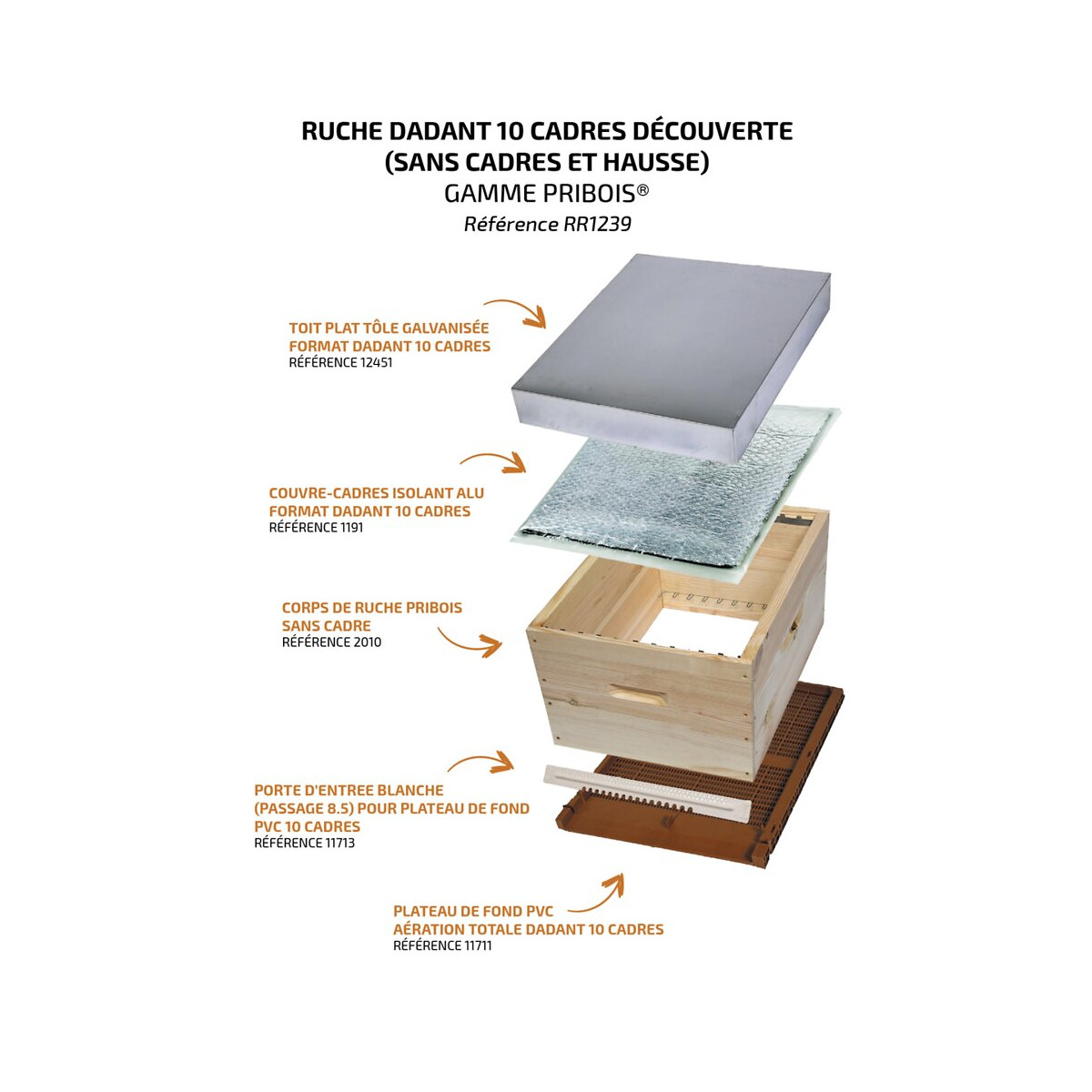 Idéale pour tous les apiculteurs, du débutant au professionnel, la ruche Dadant 10 cadres est le modèle le plus courant. Ce format vous garantit un produit de qualité au meilleur prix. Vous trouverez facilement tous les accessoires et éléments nécessaires à la conduite de votre rucher. Cette ruche gerbable vous permet donc d'étendre votre rucher selon vos envies. A la fois légère et résistante, vos abeilles pourront y travailler en toute sérénité. Les + produit : - Robuste et esthétique - En épicéa ou pin de premier choix - Assemblage mi-bois vissé sur les 4 faces - Épaisseur des parois 2.5 cm - Très bonne tenue dans le temps - Excellent rapport qualité / prix Inclinez légèrement votre ruche vers l'avant. A l'installation de votre ruche, positionnez-la sur un support de ruche qui lui donnera l'inclinaison idéale. Vous aiderez ainsi vos abeilles à l'entretien de leur environnement.