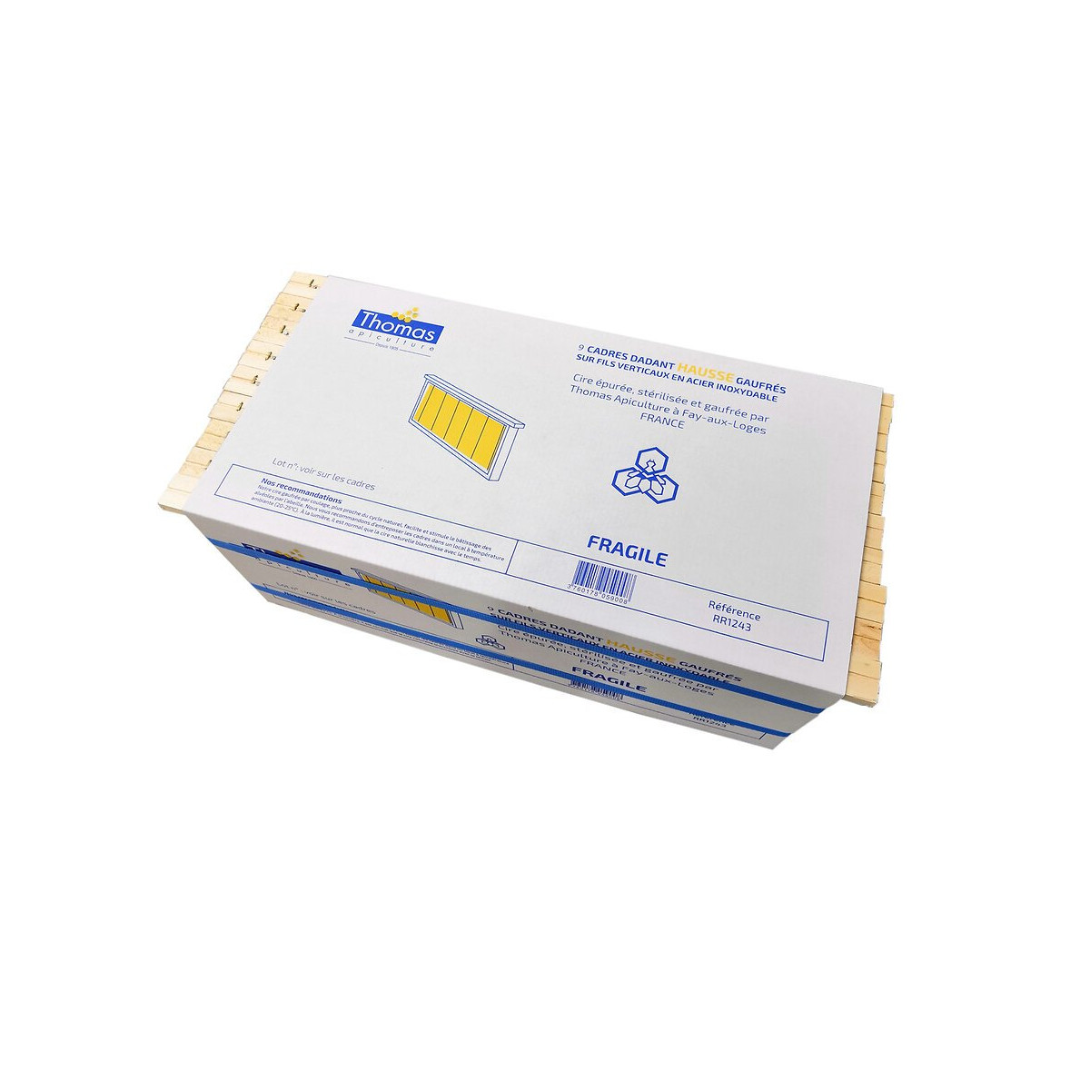 Cadre Dadant droit / mi-bois / montés / gaufrés / cerclés / filés verticalement. Le cadre garni de cire gaufrée est prêt à être utilisé directement dans la ruche. Facilitez-vous le travail, avec ce cadre prêt à l'emploi. Vous n'avez pas besoin de filer ou de garnir vous-même vos cadres de cire gaufrée. La feuille de cire gaufrée, issue de notre atelier de gaufrage, est posée sur les fils verticaux d'un cadre bois, puis fixée grâce à notre appareil de chauffe. La tête du cadre est rainurée sur le dessus et sur le dessous. Au-dessus, la rainure permet de passer le fil inox. En dessous, elle sert à positionner la feuille de cire. Lorsque votre feuille de cire sera usagée et ne sera plus utilisable dans vos ruches, vous pourrez réutiliser le cadre bois, y remettre du fil et une nouvelle feuille de cire gaufrée Thomas. Ces feuilles de cire gaufrée sont réalisées dans notre atelier de Fay-aux-Loges par coulage pour un meilleur bâtissage par les abeilles. Ce lot de cadres se compose de 10 cadres filés Dadant corps mi-bois avec 10 feuilles de cire gaufrée fixées sur les cadres. Dans une ruche forte, intercaler un cadre garni de cire gaufrée entre deux cadres de couvain augmentera la surface de ponte de la reine et réduira le risque d'essaimage. Si vous placez une hausse avec seulement des cadres garnis de cire gaufrée à l'intérieur, les abeilles mettront plus de temps à remplir. Il faut d'abord qu'elles étirent la cire. Notre conseil, dans la mesure du possible, est de mélanger les cadres déjà bâtis et les cadres garnis de cire gaufrée.