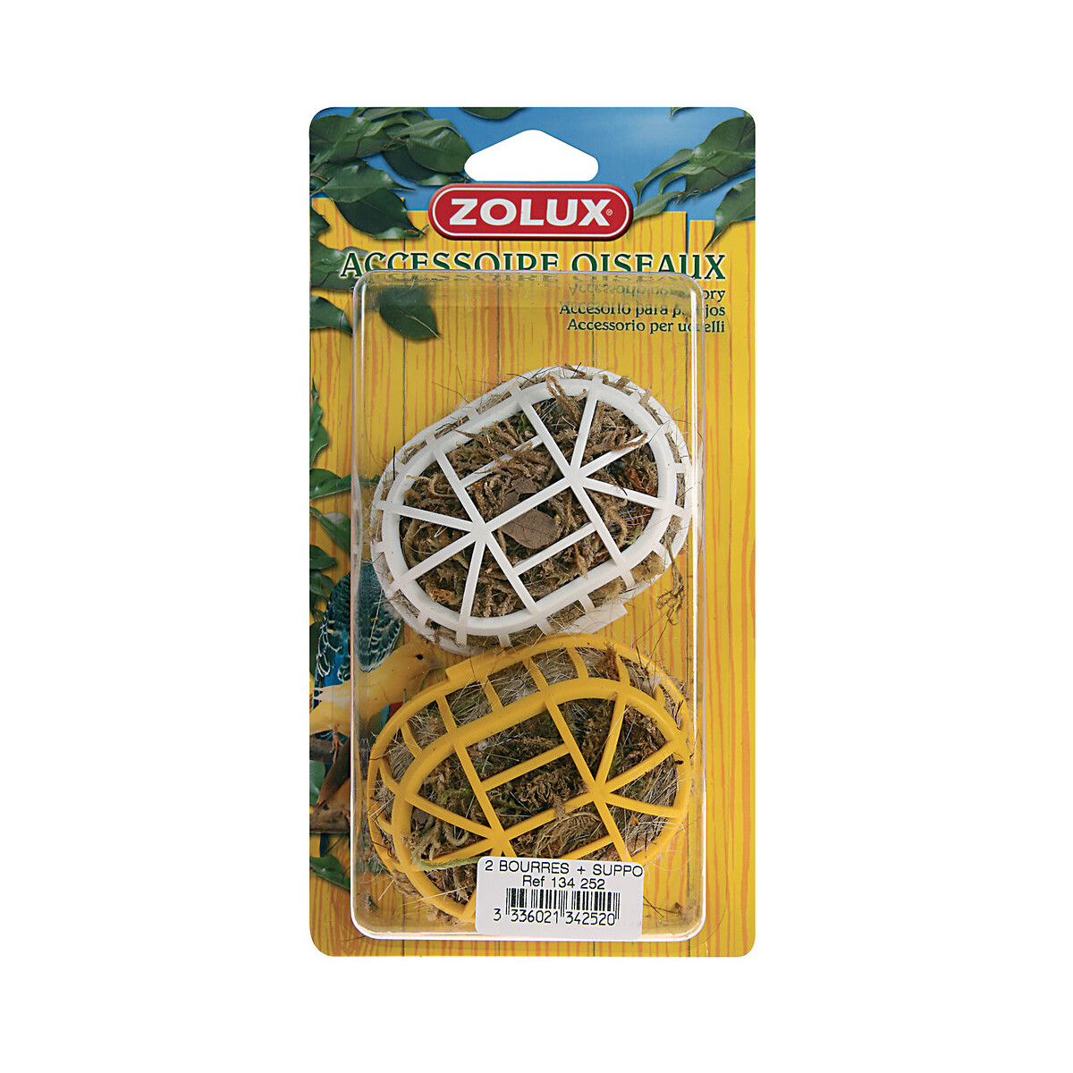 Bourres sous sphère. Et l'oiseau fait son nid ! Grâce à ce matériau de nidification votre oiseau construira son nid. Ce qui lui permettra de protéger ses œufs contre les chocs. Adaptées pour les oiseaux en cage ou volières. Pour oiseaux de toutes tailles. Dimensions : Longueur 13 cm x Largeur 7,3 cm x Profondeur : 4,5 cm. Vendu par lot de 2.Spécifications techniques