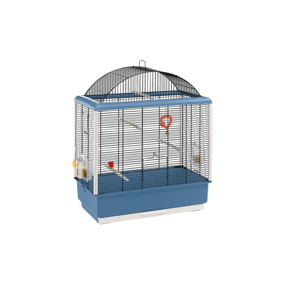 Belle cage oiseaux de taille moyenne, arrondie sur le dessus, équipée de 3 perchoirs, 1 miroir, 2 mangeoires, 1 abreuvoirSpécifications techniques