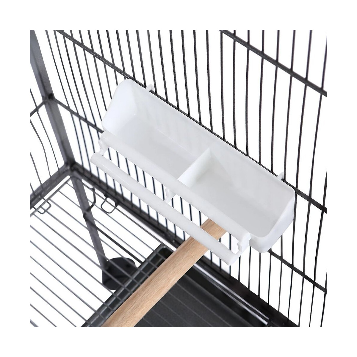 Cette grande cage à oiseaux est une demeure idéale pour vos oiseaux de compagnie. Elle comporte suffisamment d'espace et dispose de quatre perchoirs en bois pour que vos amis à plumes puissent voler et jouer en toute sécurité. Cette volière de haute qualité est entourée d'une grille en fil d'acier très serrée pour éviter les méfaits et les accidents imprévus. La construction de la grille vous permet d'observer les oiseaux et permet également aux oiseaux d'observer leur environnement et d'avoir suffisamment d'air frais. Cette cage à oiseaux solide et durable a un cadre en acier de haute qualité. Un bac coulissant au fond de la cage à oiseaux facilite le nettoyage. La cage est livrée avec 1 bac de nourriture et 1 distributeur d'eau et dispose de quatre roulettes qui facilitent le déplacement de la cage. Couleur : Noir Matériau : cadre en acier + bois + plastique Dimensions : 54 x 54 x 146 cm (L x l x H) Avec 1 bac de nourriture et 1 distributeur d'eau Avec 4 perchoirs en boisSpécifications techniques