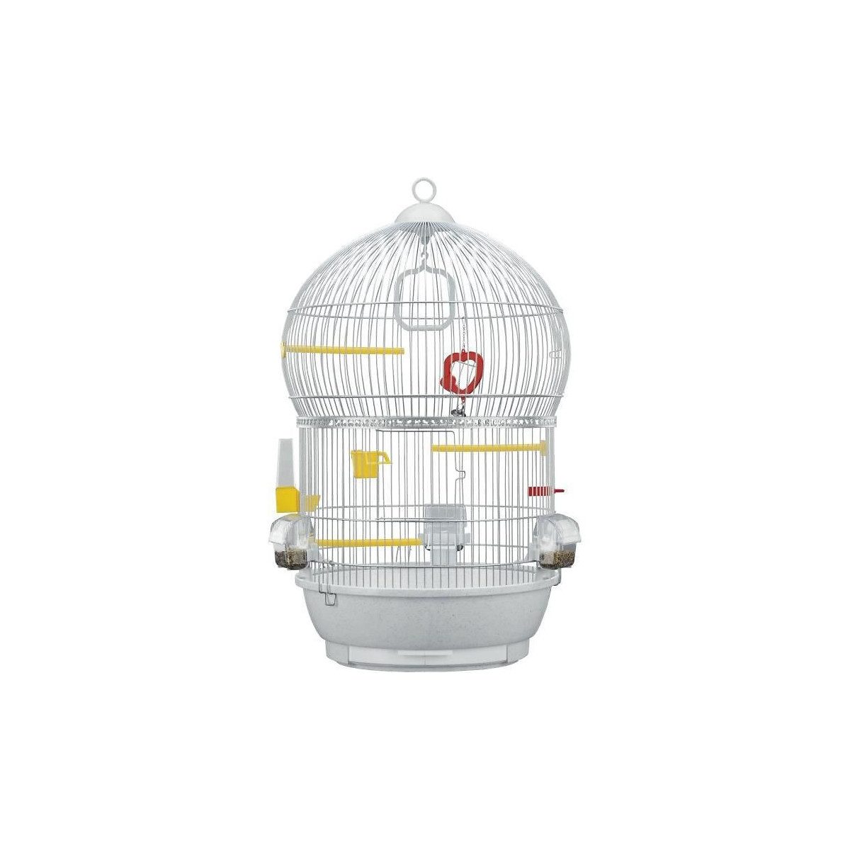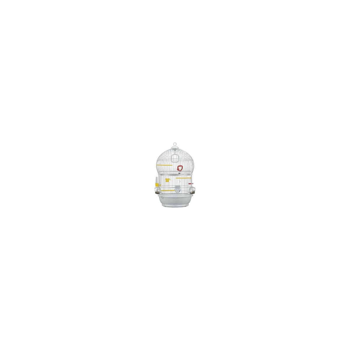 Cage ronde, élégante équipée de 3 perchoirs, 3 mangeoires, 1 abrevoir, 1 miroir, 1 pince et 1 godet.Spécifications techniques