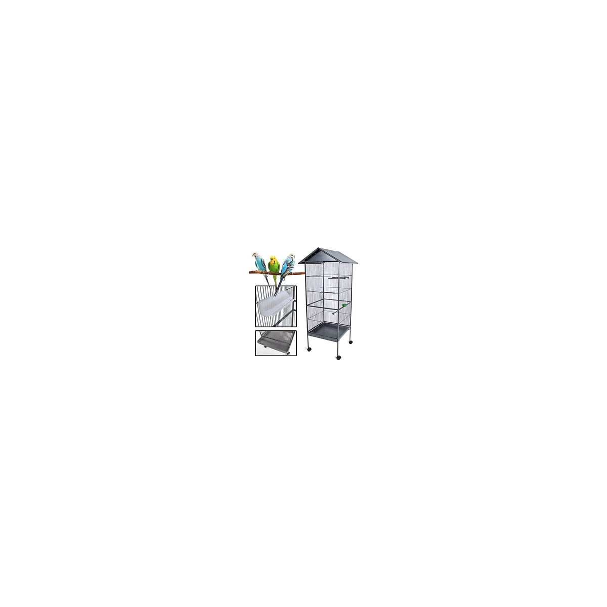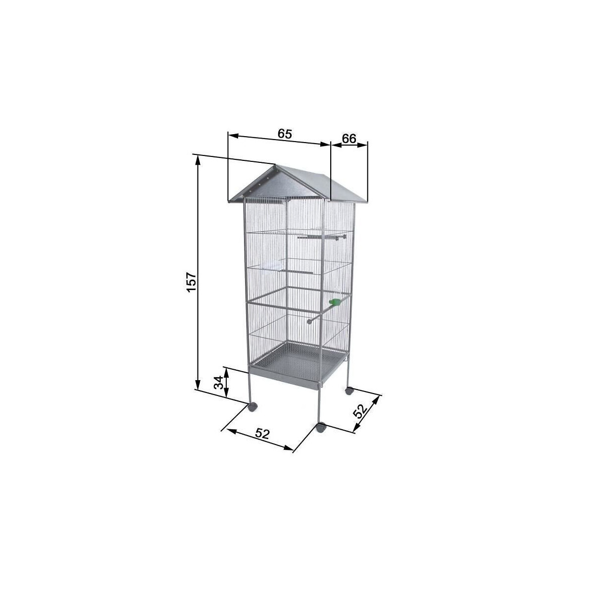 Cage a oiseaux en métal gris - Hauteur totale : 155 cm - Dimensions ext. : H155 x L52 x P52 cm int. : H128 x L49 x P49 cm - Toit ext. : 64 x 37 x 18 cm - Grande ouverture : 21 x 23 cm - Petites ouvertures : 11,5 x 21 cm - Epaisseur grille : 2 mm - Inclus : 4 roulettes, 4 perches, litiere, abreuvoir, instructions de montage.Spécifications techniques