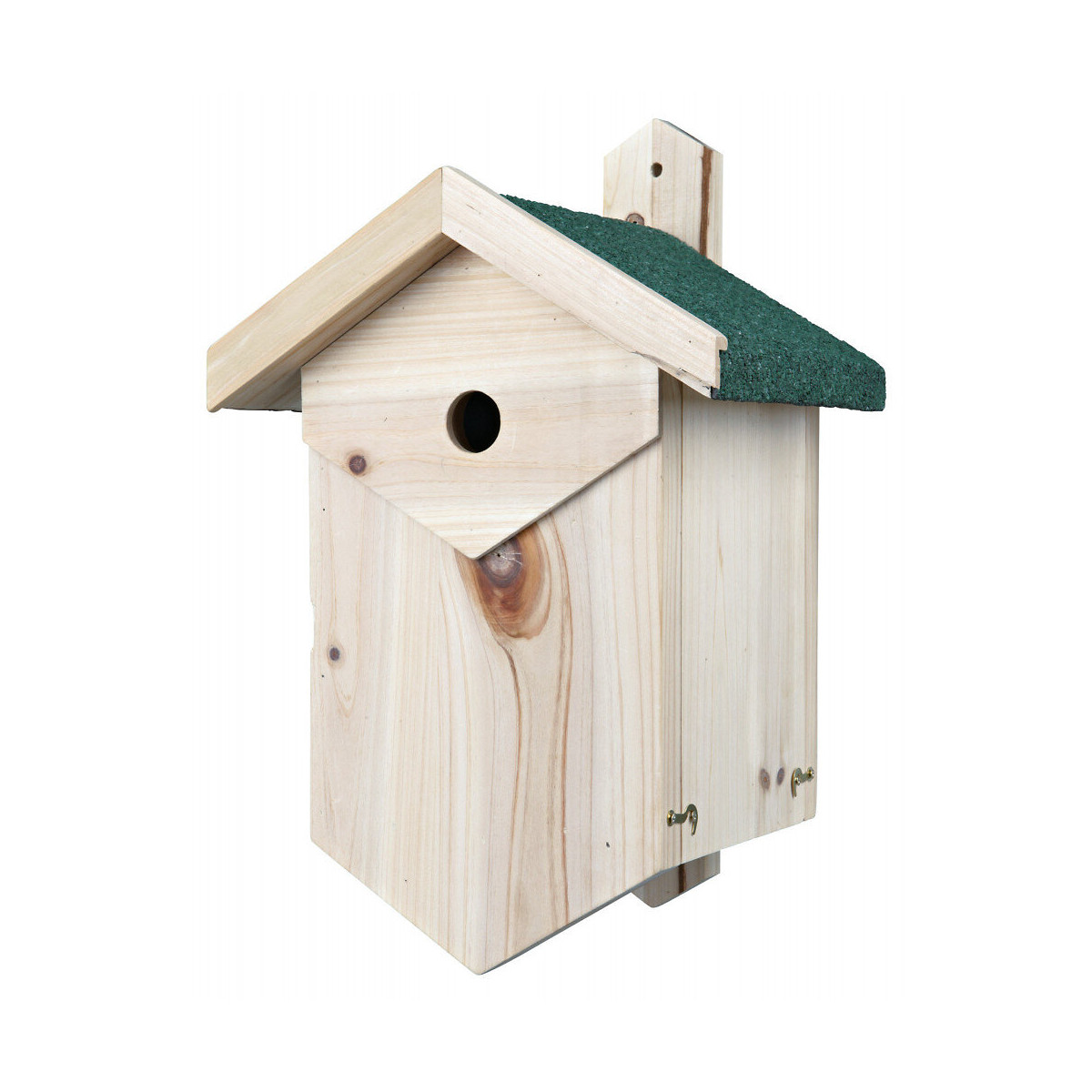 Nichoir nichant dans les cavités - En pin - Pour fixation permanente - Tres résistant aux intempéries ou aux parasites - Avec toit en shingle - Panneau avant a ouverture, facile a nettoyer - 25 × 40 × 22 cm et ø 2,7 cm - Pour oiseauSpécifications techniques