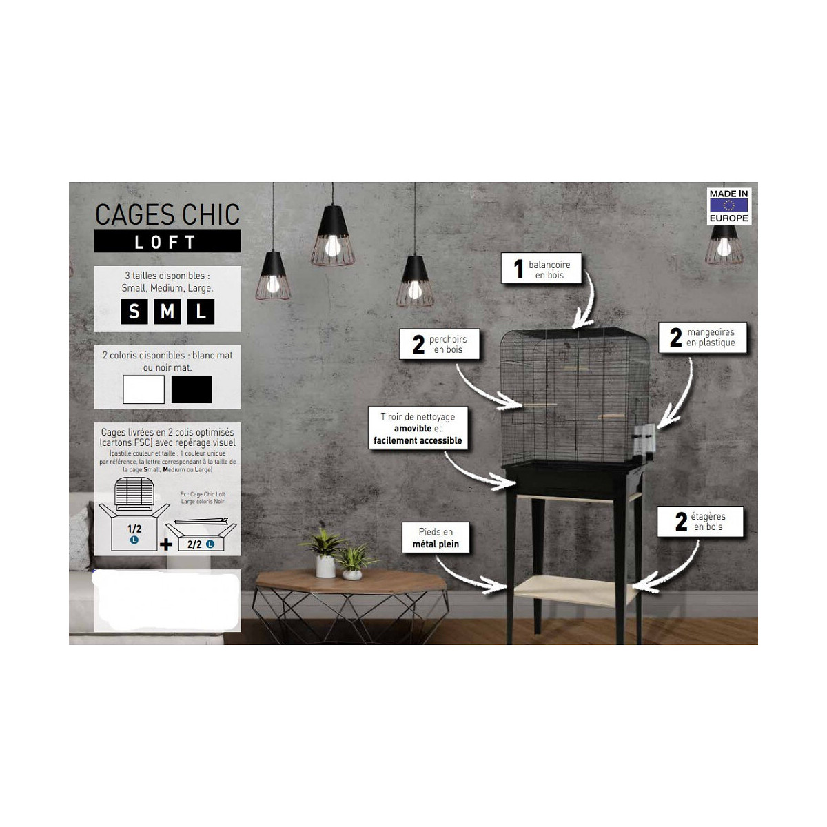 Cage et meuble CHIC LOFT. taille L. 53.5 x 33 x hauteur 134cm. couleur noir. La collection Loft propose des cages rectangulaires conçues dans l'esprit Loft / industriel avec 4 pieds en métal plein. Les meubles sont équipés de 2 étagères en bois (une pour le soutien de la cage et une seconde pour du rangement). Les cages sont équipées de : 2 perchoirs en bois, 1 balançoire en bois et 2 abreuvoirs en plastique. La taille Large est conçue pour des petites espèces de tailles moyennes comme les perruches, inséparables et paddas. Dimensions de la cage (sans les pieds) : Largeur 53.5 x profondeur 33 x hauteur 64cm. Dimensions de la cage avec les pieds : Largeur 53.5 x profondeur 33 x hauteur 134cm. Hauteur des pieds : 70cm. Espacement entre les barreaux : 10mm. Cage et meuble CHIC LOFT. taille L. 53.5 x 33 x hauteur 134cm. couleur noir. Cages design pour oiseaux domestiques vendues avec leur meuble et très faciles à monter ! La collection Loft propose des cages rectangulaires conçues dans l'esprit Loft / industriel avec 4 pieds en métal plein. Les meubles sont équipés de 2 étagères en bois (une pour le soutien de la cage et une seconde pour du rangement). Les cages sont équipées de : 2 perchoirs en bois, 1 balançoire en bois et 2 abreuvoirs en plastique. Pratique : Le nettoyage du bac ne nécessite pas de déplacer la cage, il suffit de simplement retirer le tiroir, le nettoyer et le repositionner. La taille Large possède de multiples ouvertures La taille Large est conçue pour des petites espèces de tailles moyennes comme les perruches, inséparables et paddas. 2 coloris au choix : blanc mat ou noir mat. Dimensions de la cage (sans les pieds) : Largeur 53.5 x profondeur 33 x hauteur 64cm. Dimensions de la cage avec les pieds : Largeur 53.5 x profondeur 33 x hauteur 134cm. Hauteur des pieds : 70cm. Espacement entre les barreaux : 10mm. Photo non contractuelle, car il y a plusieurs vendeurs sur une même fiche produit.Spécifications techniques
