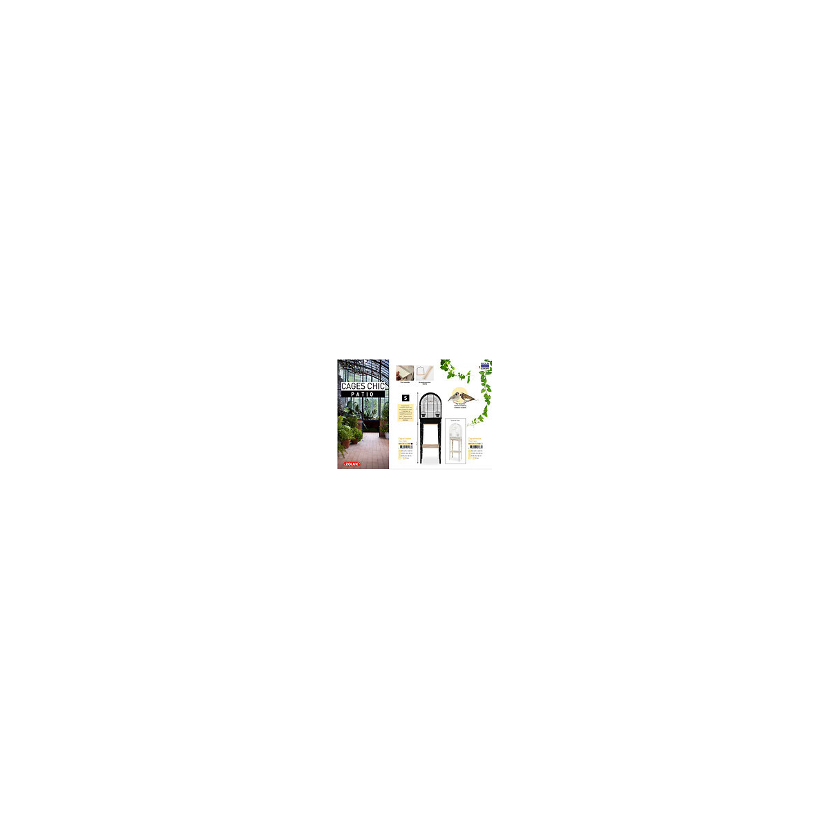 Cage et meuble CHIC PATIO. taille S. 38 x 24.5 x hauteur 123 cm. couleur blanc. Le meuble est équipé de 2 étagères en bois (une pour le soutien de la cage et une seconde pour du rangement). La cage est équipée de : 2 perchoirs en bois, 1 balançoire en bois et 2 abreuvoirs en plastique. Pratique : Le nettoyage du bac ne nécessite pas de déplacer la cage, il suffit de simplement retirer le tiroir, le nettoyer et le repositionner. La taille Small est conçue pour des petites espèces (mandarins, moineaux du japon). Dimensions de la cage (sans les pieds) : Largeur 38 x profondeur 24,5 x hauteur 53cm. Dimensions de la cage avec les pieds : Largeur 38 x profondeur 24,5 x hauteur 123cm. Hauteur des pieds : 70cm. Espacement entre les barreaux : 10mm. Cage et meuble CHIC PATIO. taille S. 38 x 24.5 x hauteur 123 cm. couleur blanc. Cages design pour oiseaux domestiques vendues avec leur meuble et très faciles à monter ! La collection Patio propose des cages arrondies conçues dans l'esprit Patio / floral avec 4 pieds en métal décorés (motifs floraux). Le meuble est équipé de 2 étagères en bois (une pour le soutien de la cage et une seconde pour du rangement). La cage est équipée de : 2 perchoirs en bois, 1 balançoire en bois et 2 abreuvoirs en plastique. Pratique : Le nettoyage du bac ne nécessite pas de déplacer la cage, il suffit de simplement retirer le tiroir, le nettoyer et le repositionner. La taille Small est conçue pour des petites espèces (mandarins, moineaux du japon). 2 coloris au choix : blanc mat ou noir mat. Dimensions de la cage (sans les pieds) : Largeur 38 x profondeur 24,5 x hauteur 53cm. Dimensions de la cage avec les pieds : Largeur 38 x profondeur 24,5 x hauteur 123cm. Hauteur des pieds : 70cm. Espacement entre les barreaux : 10mm. Photo non contractuelle, car il y a plusieurs vendeurs sur une même fiche produit.Spécifications techniques