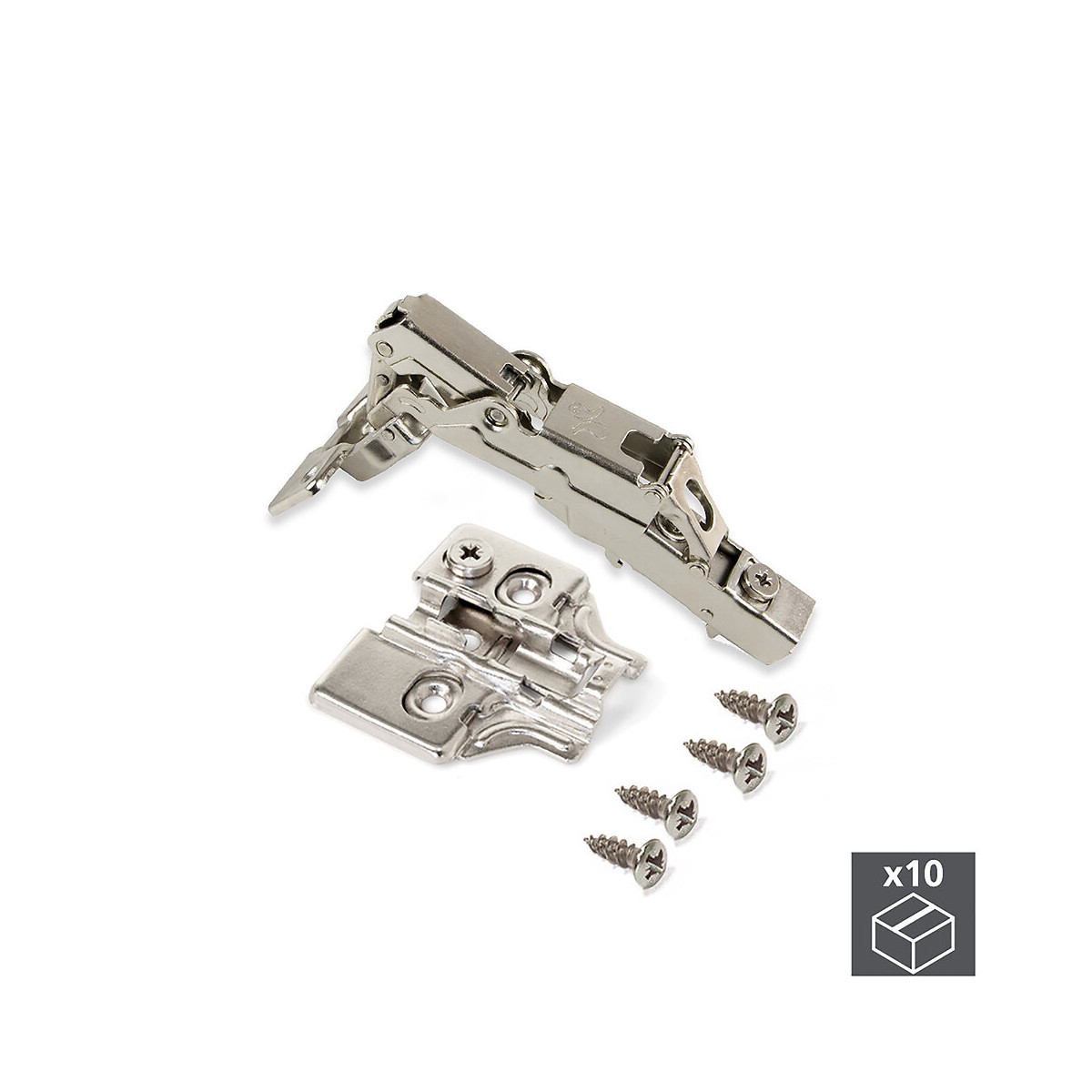 Charnières pour les portes des meubles de la cuisine, la maison, la salle de bain et le bureau et pour vos armoires. Haute qualité au meilleur prix. Leur piston amortisseur assure une fermeture en douceur de la porte. Leur principale caractéristique est l'amplitude de l'ouverture à 165º. Elles sont disponibles en version droite, coudée pour montage en applique et coudée pour montage rentrant. Leur installation requiert d’un perçage préalable de 35 mm de diamètre pour le boîtier. Fixation au panneau avec les vis fournies.Le système automatique de montage clipsable de la charnière sur l’embase facilite l’installation. Réglage rapide et pratique de la charnière et de l’embase au moyen de vis excentrique.Spécifications techniques