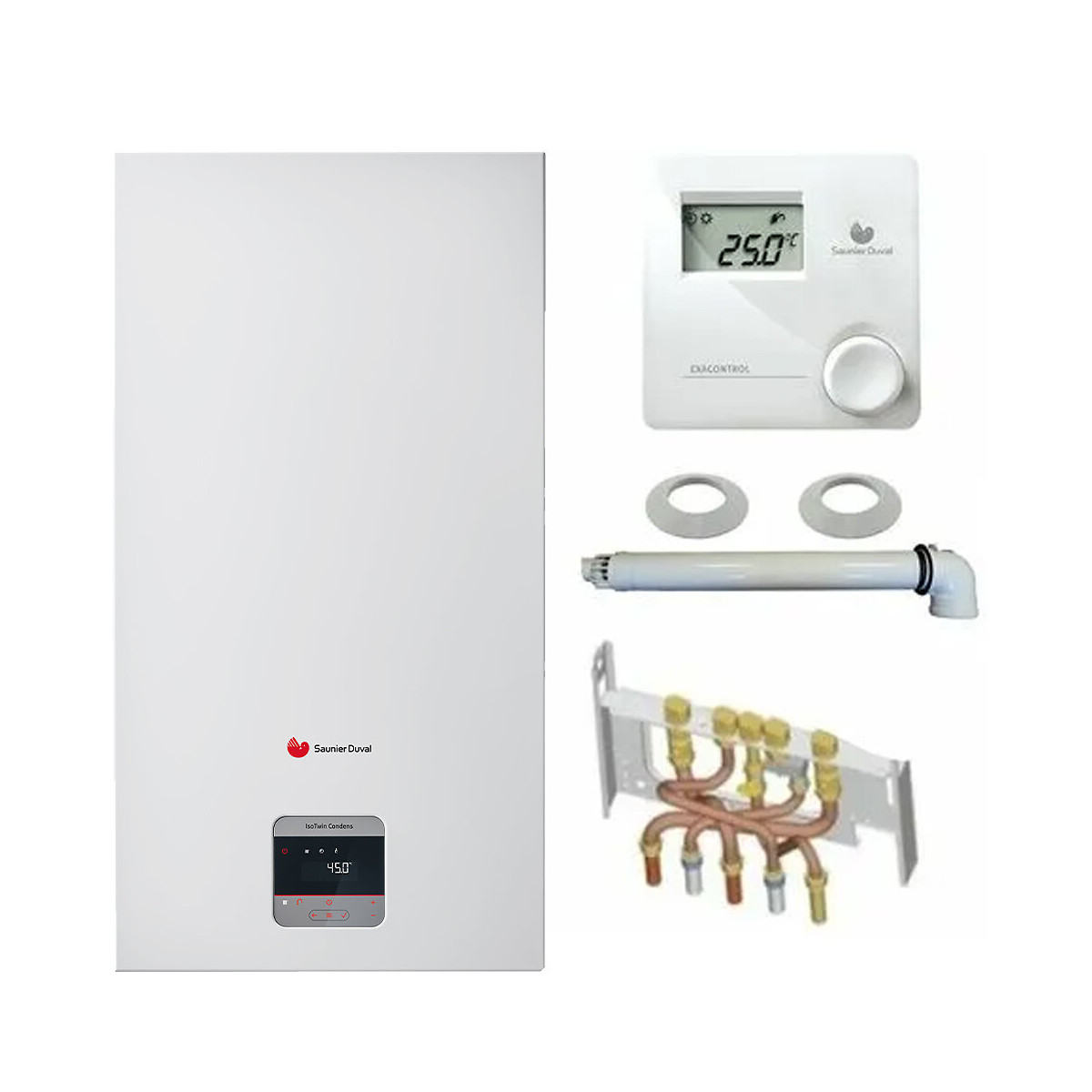 PACK CHAUDIERE COMPRENANT CHAUDIERE Isowtin Condens F 25 + Barrette de robinetterie + Jeu de douilles + Ventouse Condensation + Thermostat Filaire Exacontrol E Stabilité de température de l'eau chaude avec une grande réserve de 42 litres qui sont régénérés en seulement 5 minutes offrant un débit jusqu'à 18,5 litres/minute. Jusqu'à 109,2 % de rendement utile pour de réelles économies de gaz. Bénéficiez d'un crédit d'impôt sur les chaudières à condensation. La chaudière est mieux isolée, cela permet de réduire ses émissions sonores Puissance minimale basse pour s'adapter aux logements nécessitant une faible puissance de chauffage Mode d'évacuation Ventouse condensation Energie Gaz naturel et propane (simple réglage) Usage Chauffage + eau chaude sanitaire Classe énergétique chauffage A Classe énergétique sanitaire A Rendement énergétique saisonnier 92 % Puissance utile à 80 / 60°C 4,9 à 18,1 kW Puissance utile à 50 / 30°C 5,4 à 19,6 kW Température maxi départ chauffage 80°C Pression maxi chauffage 3 bar Débit spécifique suivant EN 13203 (ΔT=30 K) 18,5 litres/minute Capacité vase d'expansion 12 litres Rendements à charge 100% Pn 97,7 % Rendements à charge 30 % Pn 108,4 % Régulation Modulante Dimensions (HxLxP) 892 x 470 x 502 mm Poids 63 kg Pour la Garantie 2 ans Fabricant n'oubliez pas: La mise en service doit être effectuée par une station technique agrée par la marque