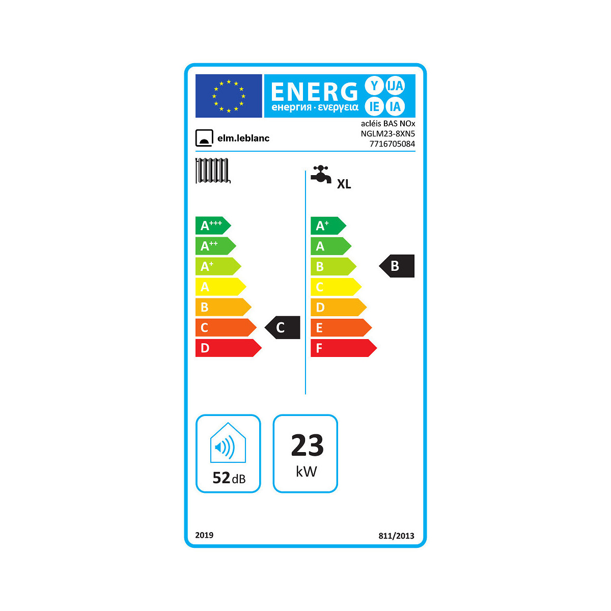 PACK CHAUDIERE COMPRENANT CHAUDIERE Acléis NGLM 23-8XN5 + Barrette de robinetterie + Jeu de douilles PRETE A POSER - COMPLETE La chaudière alliant performance et design Design épuré s'intégrant parfaitement dans tous type de logement Chaudière compacte pouvant être installée dans les endroits exigus avec seulement 40 cm de large Mini-accumulation avec un ballon de 5 litres garantissant de l'eau chaude sans attendre et une stabilité de la température au demi degré près. Nouveau brûleur échangeur à flamme refroidie plus écologique émettant moins d'oxydes d'azote tout en conservant de hautes performances en chauffage Caractéristiques Acléis BasNox NGLM 23-8XN5 Mode d'évacuation VMC Energie Gaz naturel Usage Chauffage + eau chaude sanitaire Classe énergétique chauffage C Classe énergétique sanitaire B Etas 72 % Rendement à charge 30% 89,8 % Puissance utile maximale 23 kW Température maxi chauffage 90°C Pression maxi chauffage 3 bar Débit spécifique suivant EN 13203 (?T=30 K) 11 litres/minute Capacité vase d'expansion 5 litres Profil de soutirage XL Diamètre de buse 125 mm Régulation Modulante Dimensions (HxLxP) 865 x 400 x 385 mm Poids 34 kg Pour la Garantie 2 ans Fabricant n'oubliez pas: La mise en service doit être effectuée par une station technique agrée par la marque La Cheminée et la gaine accordéon spéciale gaz nest pas fournie avec le produit