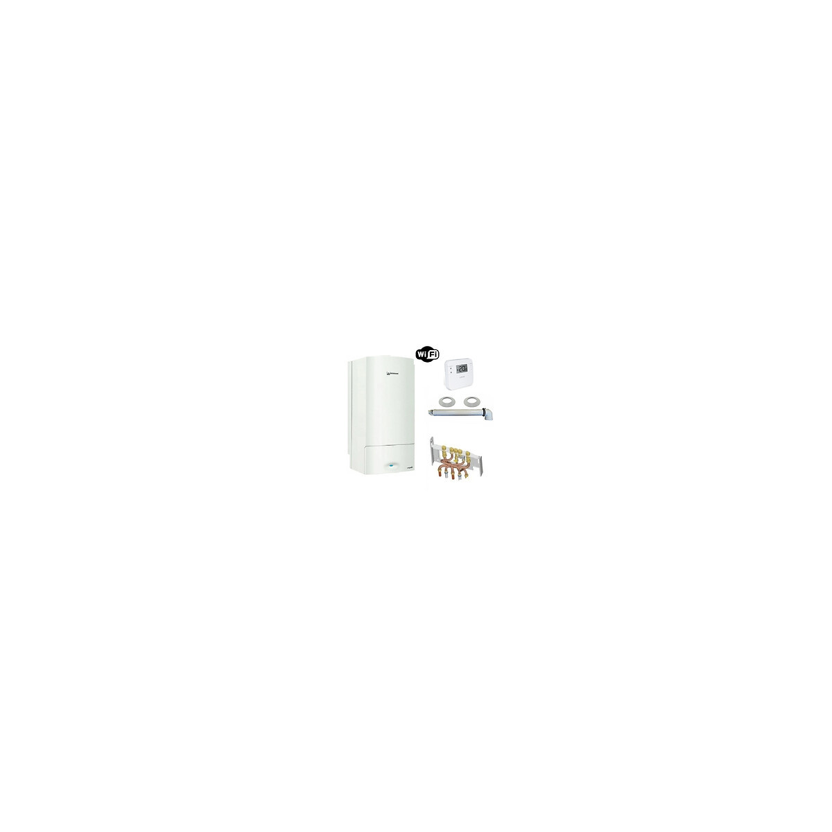 PACK CHAUDIERE COMPRENANT CHAUDIERE Megalis condens GVA C 24-5M + Barrette de robinetterie + Jeu de douilles + Ventouse condensation + Thermostat Connecté PRETE A POSER - COMPLETE Chaudière Gaz Murale condensation Megalis Condens E.L.M Leblanc 24 kW Complète (Ventouse + Douilles + Dosseret) avec thermostat WIFI La chaudière alliant haut rendement et confort sanitaire Très haut rendement énergétique jusqu'à 109,3 % permettant une réduction de la consommation électrique Chaudière intégrant une pompe modulante à haut rendement énergétique (classe A) Mini-accumulation avec un ballon de 7 litres garantissant de l'eau chaude sans attendre et une stabilité de la température au demi degré près. Simplicité d'installation grâce à un encombrement minimum, un design épuré et des raccordements hydrauliques standards Caractéristiques générales Megalis Condens GVA C 24-5M Mode d'évacuation Ventouse Condensation Energie Gaz naturel Usage Chauffage + eau chaude sanitaire Classe énergétique chauffage A Classe énergétique sanitaire A Etas 93 % Rendement à charge 30% 109,3 % Puissance utile maximale 24 kW Température maxi chauffage 90°C Pression maxi chauffage 3 bar Débit spécifique suivant EN 13203 (?T=30 K) 12 litres/minute Capacité vase d'expansion 7 litres Profil de soutirage XL Diamètre de buse 60/100 mm Régulation Modulante Dimensions (HxLxP) 867 x 400 x 377 mm Poids 39,8 kg Pour la Garantie 2 ans Fabricant n'oubliez pas: La mise en service doit être effectuée par une station technique agrée par la marque La Cheminée et la gaine accordéon spéciale gaz nest pas fournie avec le produit