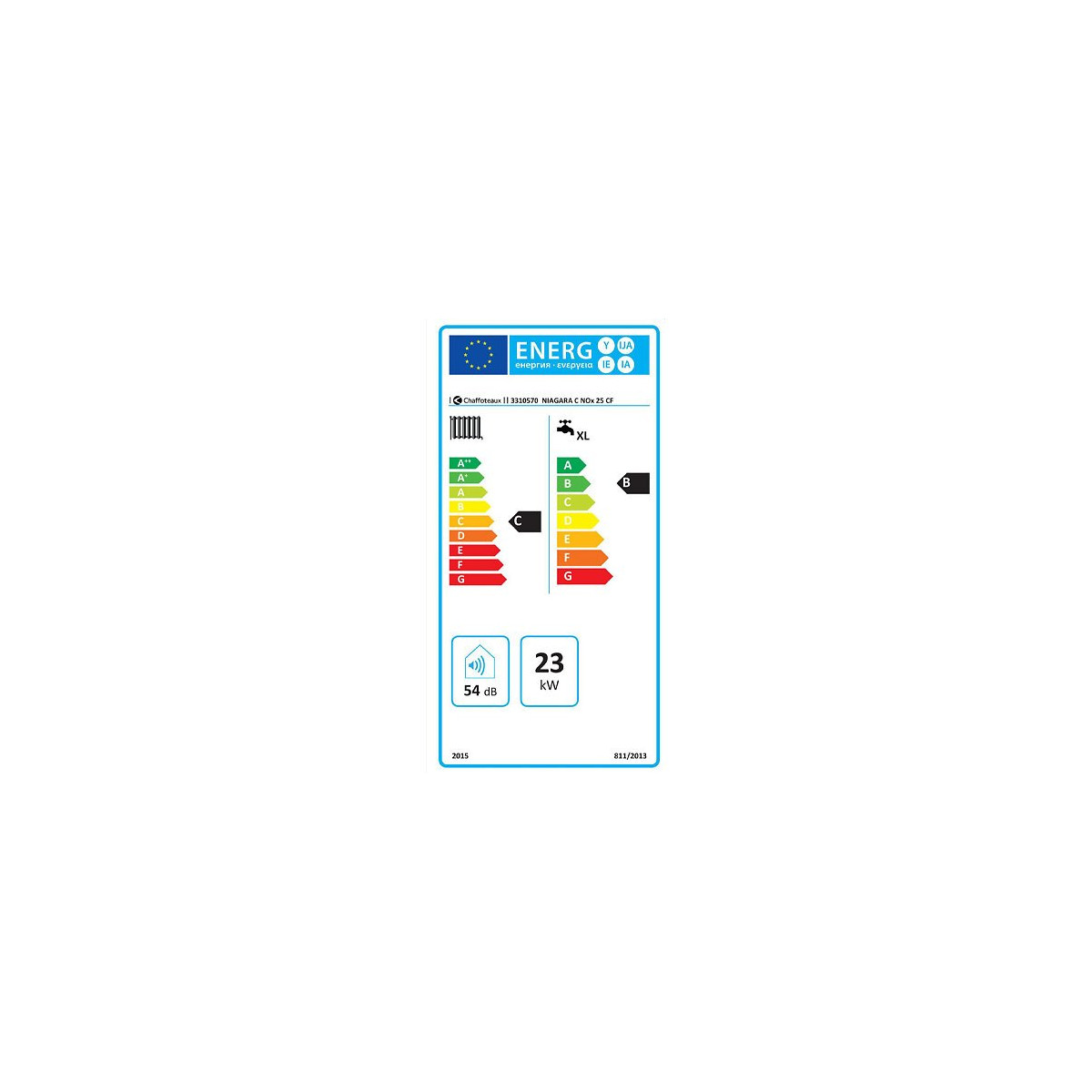 PACK CHAUDIERE COMPRENANT Niagara C Nox 25 Cheminée + Barrette de robinetterie + Jeu de douilles PRETE A POSER - COMPLETE Chaudière avec ballon intégré de 40 litres Conforme à la nouvelle norme avec une faible émission Nox (gaz polluant) Maintenance simplifiée par l'accessibilté de tous les composants par l'avant de l'appareil Caractéristiques générales Niagara C Nox 25 CF Mode d'évacuation Cheminée Energie Gaz naturel Usage Chauffage + eau chaude sanitaire Classe énergétique chauffage C Classe énergétique sanitaire B Puissance utile 24 kW Température maxi chauffage 82°C Pression maxi chauffage 3 bar Débit spécifique suivant EN 13203 (ΔT=30 K) 18,7 litres/minute Capacité vase d'expansion 10 litres Rendements à charge 100% Pn 91,9 % Rendements à charge 30 % Pn 91,2 % Pertes à l'arrêt à ΔT = 30 K 100 W Dimensions (HxLxP) 900 x 600 x 474 mm Poids 52 kg Pour la Garantie 2 ans Fabricant n'oubliez pas: La mise en service doit être effectuée par une station technique agrée par la marque La Cheminée et la gaine accordéon spéciale gaz n’est pas fournie avec le produit
