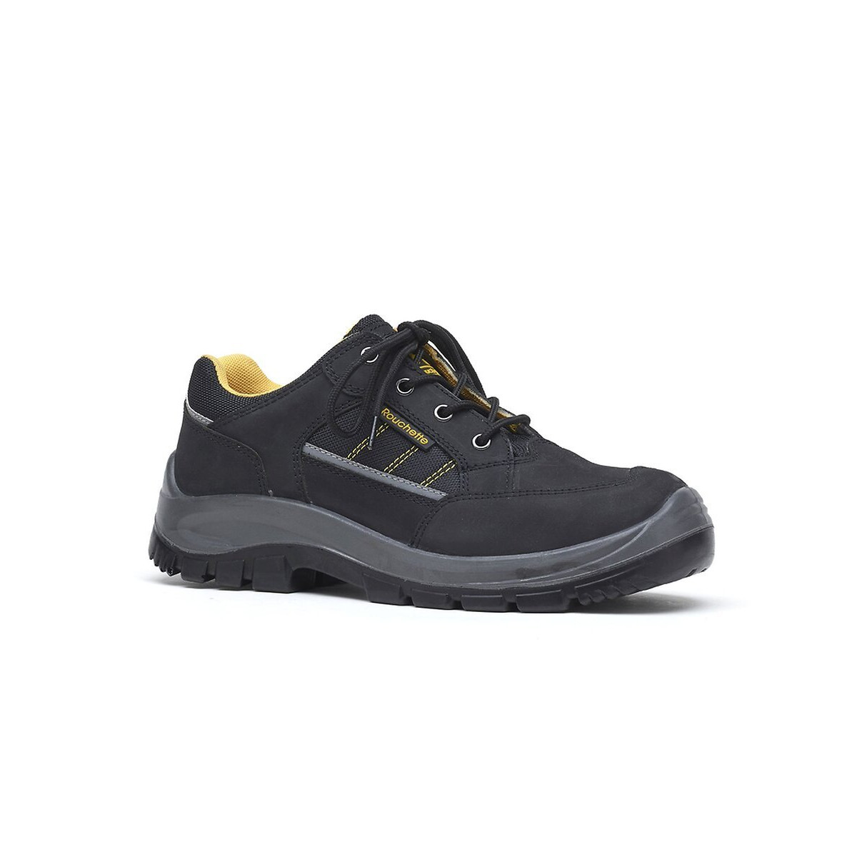 Chaussure de sécurité en croûte de cuir imperméable, doublure en textile respirant, coquille acier et semelle anti perforation, antistatique, semelle en polyuréthane résistante aux huiles et à l'abrasion. Coloris noir et jaune Taille 43