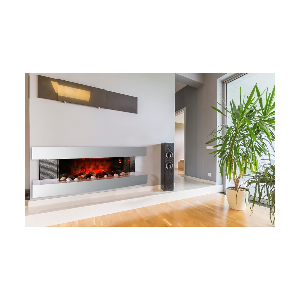 • Effet flammes ultra réaliste : technologie à leds Chemin’Arte • Puissance : 2000W, protection contre la surchauffe • Livrée assemblée. Aucun montage nécessaire. • Design moderne lounge • Se fixe au mur ou se pose au sol • Structure en bois MDF blanc glossy • Livré avec des galets (le bois est une suggestion de présentation) Dimensions : L120xP31xH46cm Livrée assemblée avec un manuel d’utilisation, buches.