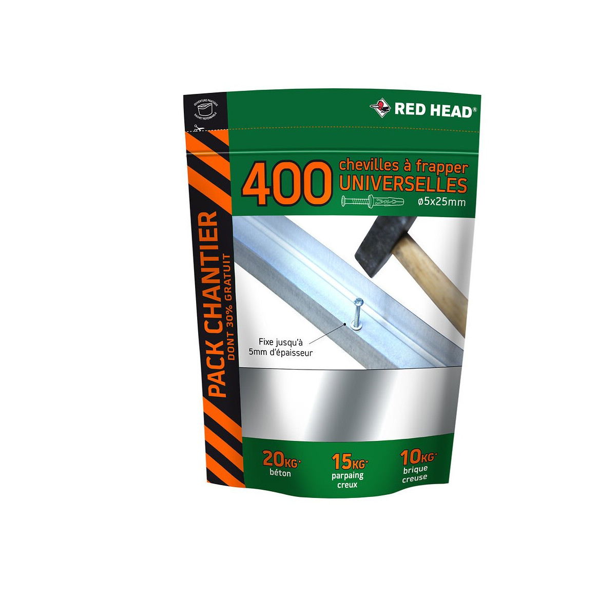 Sachet de 400 chevilles à frapper 5 idéale pour fixer des rails métalliques, rails plaque de plâtre, plinthes, pattes métalliques, goulottes barres de seuil. Elle se choisit en fonction de l'épaisseur à fixer désignée par sa partie lisse sous la collerette. Idéale pour les travaux répétitifs. Il suffit de la frapper au marteau pour déclencher l'expansion.Spécifications techniques