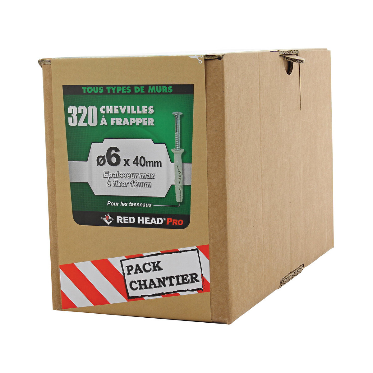 Boîte de 320 Frapex M 6x40mm.La cheville Frapex M est la seule cheville frapper fonctionnant dans tous les matériaux supports : pleins, creux, y compris plaque de plâtre pour les petites dimensions. Elle se choisit en fonction de l'épaisseur à fixer désignée par sa partie lisse sous la collerette. Idéale pour les travaux répétitifs. Il suffit de la frapper au marteau pour déclencher l'expansion. A utiliser pour la pose des tasseaux. Rails métalliques. Rails de plaque de plâtre. Plinthes. Pattes métalliques. goulottes. Barres de seuil. Elle se choisit en fonction de l'épaisseur à fixer désignée par sa partie lisse sous la collerette. Idéale pour les travaux répétitifs. Il suffit de la frapper au marteau pour déclencher l'expansion.Spécifications techniques
