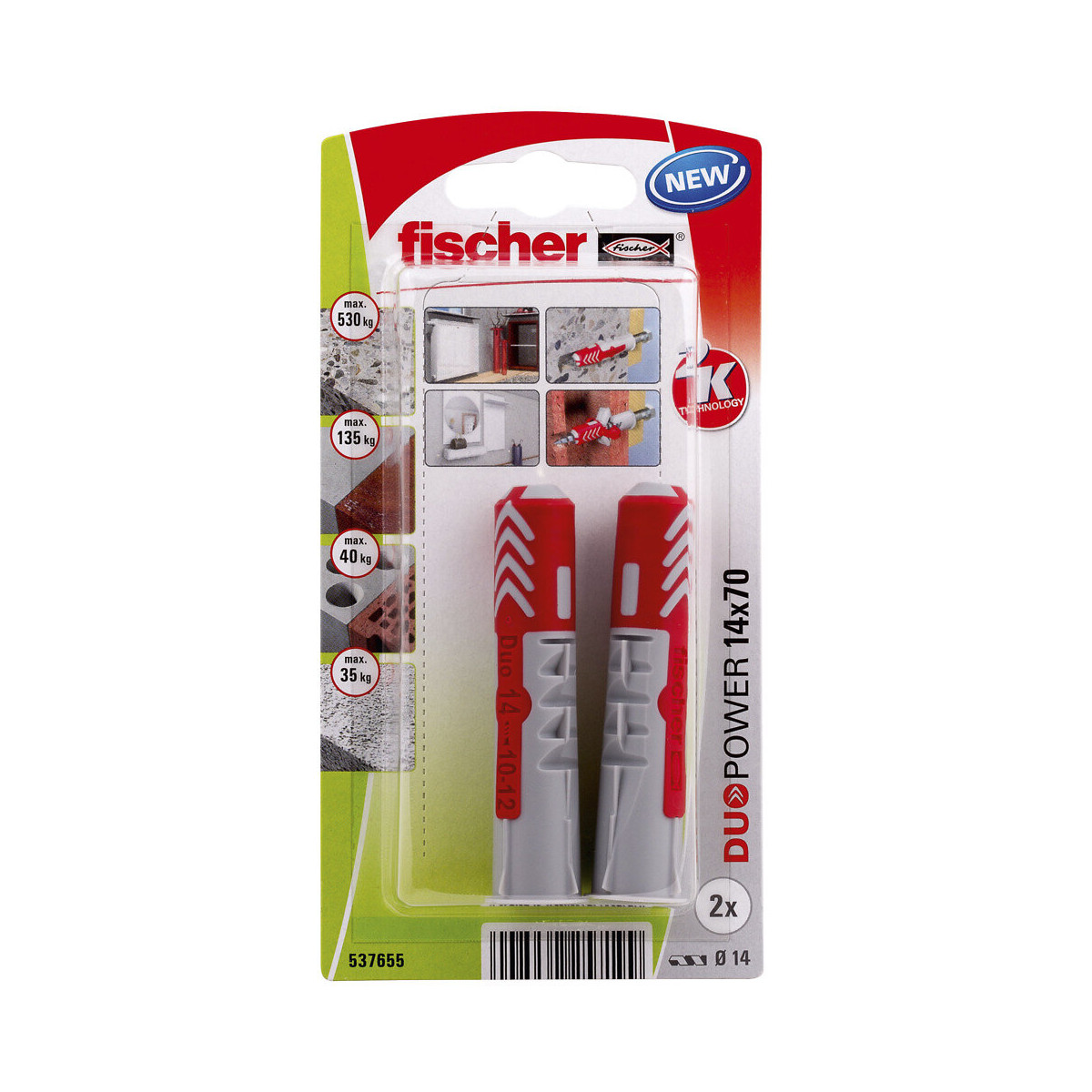 Cheville DUOPOWER tous matériaux. Offre une grande résistance grâce à ses 2 composants : composant gris nylon haute qualité active qui automatiquement le mode de fonctionnement optimal en fonction du matériau de construction pour une tenue optimale : et ailettes d'expansion du composant rouge favorisant une expansion sûre et sécuritaire. Vissage facile sans rotation de la vis. Collerette évitant le glissement de la cheville dans le forage. Ergots anti-rotation. Dimensions 14x70mm.Spécifications techniques