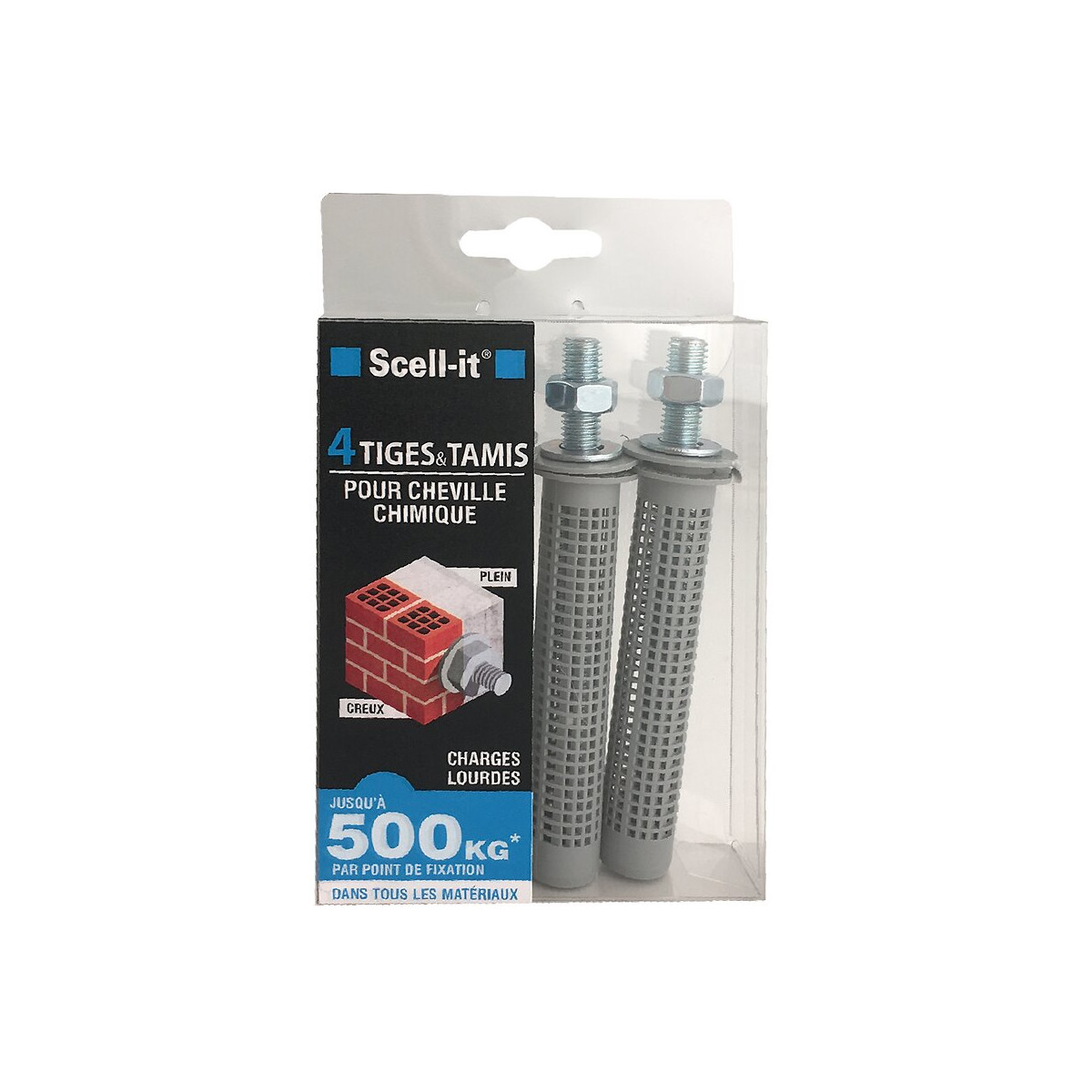 4 tiges acier M8x110 + 4 tamis. Diamètre 15x85 pour la fixation de charge jusqu'à 500 kg Pour la fixation de charge lourdes dans tous les matériaux, jusqu'à 500 kg par point de fixation.Spécifications techniques