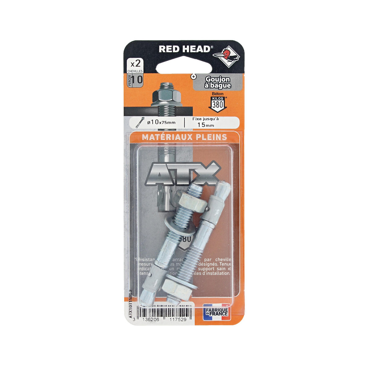 Blister de 2 ATX 10x75mm.Le goujon à bague ATX permet de fixer de manière rapide et sûre toutes les charges lourdes à très lourdes. Elle est préconisée pour la pose d'applications structurelles dans le béton. Possibilité de fixer des éléments sur des dalles de 80mm. Idéal pour le béton préfabriqué. A utiliser pour la fixation des constructions métalliques, garde-corps, consoles, échelles, escaliers, chemins de câble, pièces métalliques et tasseaux. Fabrication française.Spécifications techniques