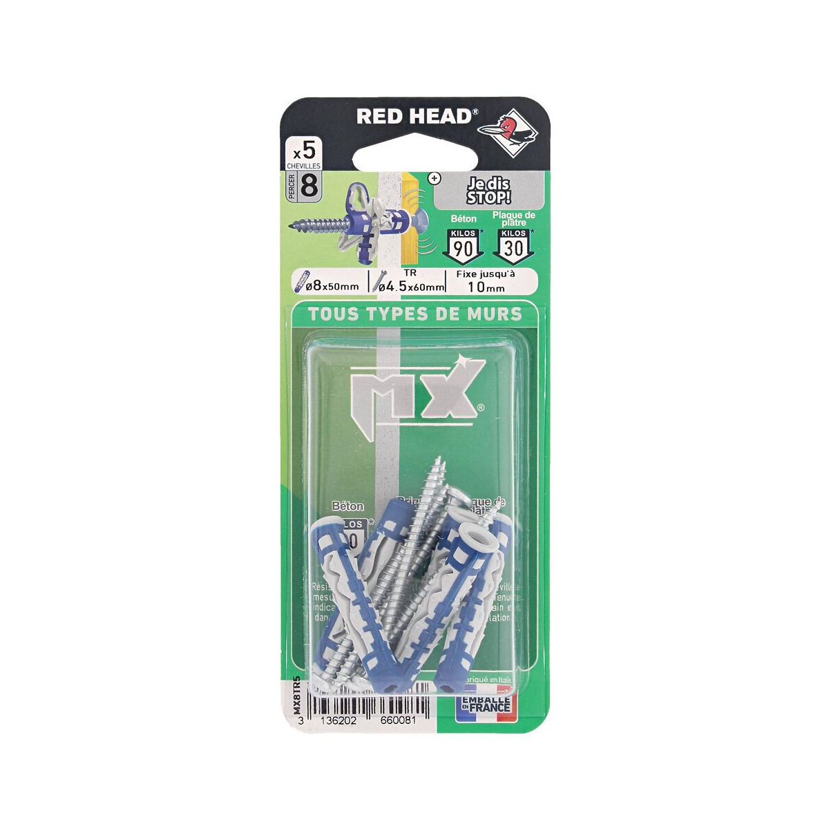5 chevilles 8x50 mm + vis tête ronde. La cheville Mx est un concentré de technologie aux performances inégalées dans sa catégorie.Spécifications techniques
