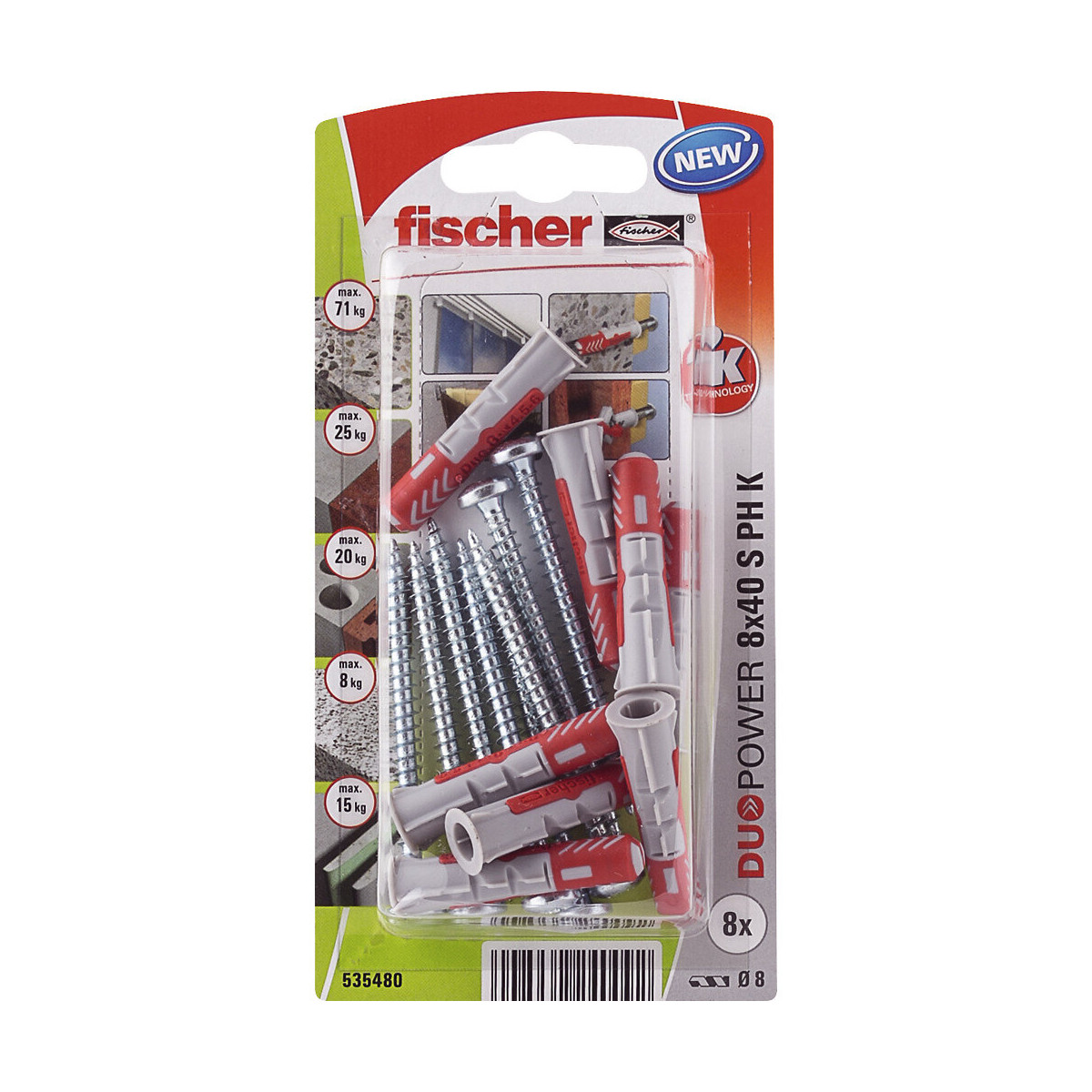 Cheville DUOPOWER tous matériaux. Offre une grande résistance grâce à ses 2 composants : composant gris nylon haute qualité active qui automatiquement le mode de fonctionnement optimal en fonction du matériau de construction pour une tenue optimale : et ailettes d'expansion du composant rouge favorisant une expansion sûre et sécuritaire. Vissage facile sans rotation de la vis. Collerette évitant le glissement de la cheville dans le forage. Dimensions 8x40mm.Spécifications techniques