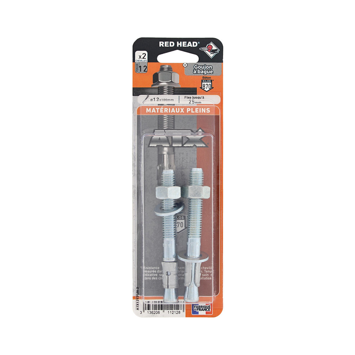 Blister de 2 ATX 12x100mm.Le goujon à bague ATX permet de fixer de manière rapide et sûre toutes les charges lourdes à très lourdes. Elle est préconisée pour la pose d'applications structurelles dans le béton. Possibilité de fixer des éléments sur des dalles de 80mm. Idéal pour le béton préfabriqué. A utiliser pour la fixation des constructions métalliques, garde-corps, consoles, échelles, escaliers, chemins de câble, pièces métalliques et tasseaux. Fabrication française.Spécifications techniques
