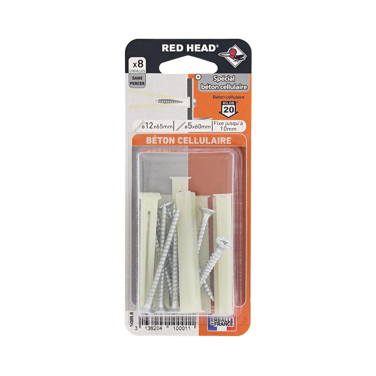 Blister de 8 SQ 12x75mm + vis TF 5x60mm.La cheville SQ est conçue pour fonctionner de manière optimale dans le béton cellulaire. Sa forme carrée empêche la cheville de tourner dans le mur. La pose est facile est sûre. Pour une résistance de 20 kg par fixation : la cheville se cloue directement dans le matériau supports. Elle ne nécessite aucun perçage. Idéale pour la pose des convecteurs, accessoires de salle de bain. Etagères. Stores d'intérieur. Cadres. Miroirs. Embrasses. Meubles. Tasseaux. Equerres. Pose facile et rapide : se cloue directement dans le mur sans perçage.Spécifications techniques
