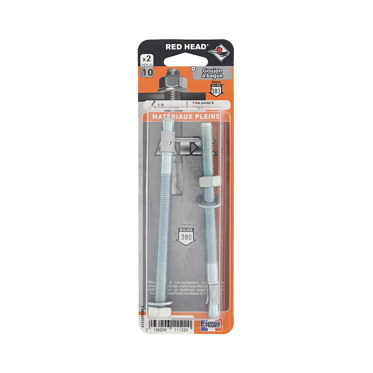 Blister de 2 ATX 10x140mm.Le goujon à bague ATX permet de fixer de manière rapide et sûre toutes les charges lourdes à très lourdes. Elle est préconisée pour la pose d'applications structurelles dans le béton. Possibilité de fixer des éléments sur des dalles de 80mm. Idéal pour le béton préfabriqué. A utiliser pour la fixation des constructions métalliques, garde-corps, consoles, échelles, escaliers, chemins de câble, pièces métalliques et tasseaux. Fabrication française.Spécifications techniques