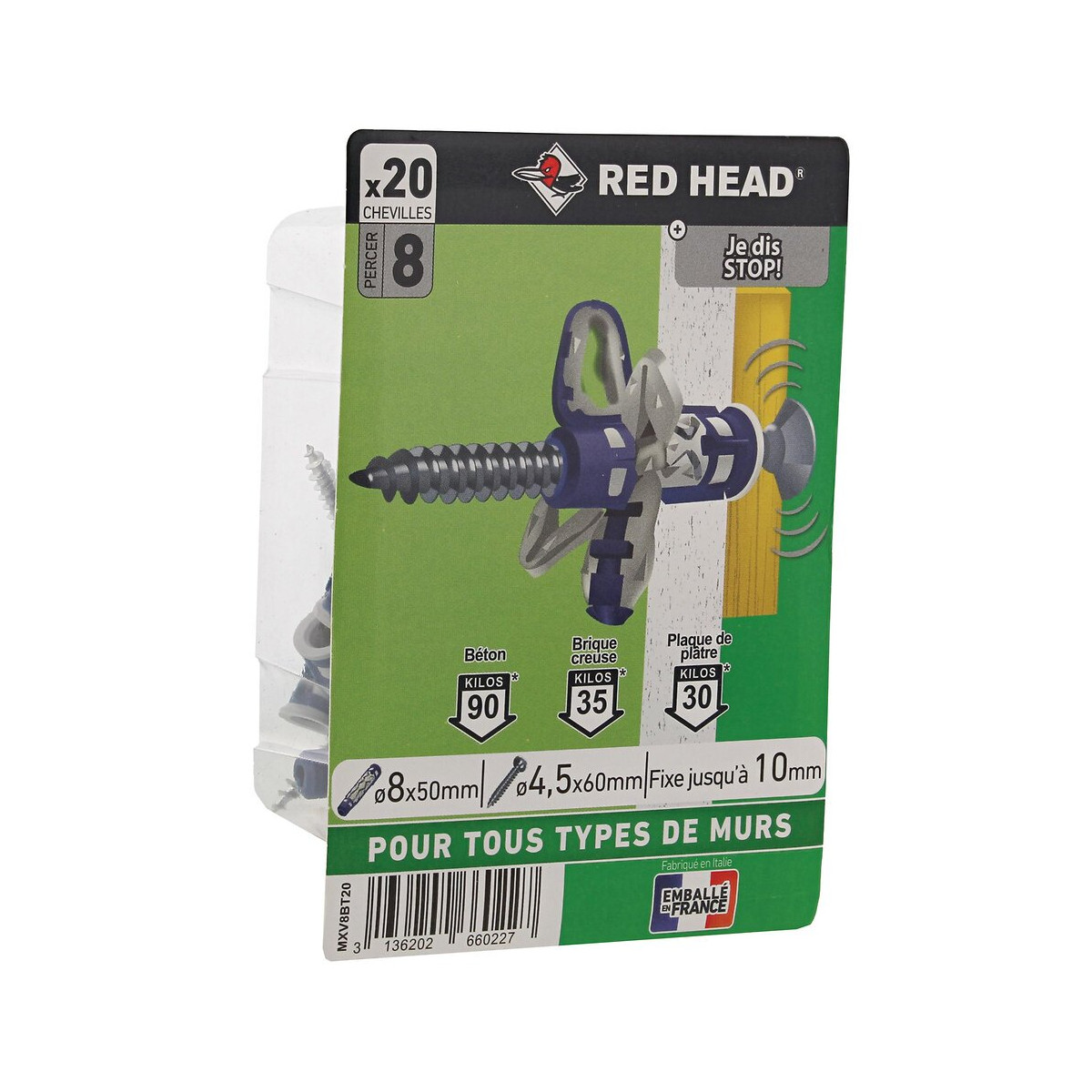 Boîte de 20 Mx 8x50mm + vis TR 4.5x60mm. La cheville Mx est un concentré de technologie aux performances inégalées dans sa catégorie. Elle s'adapte parfaitement à tous types de matériaux. Pleins comme creux, y compris la plaque de plâtre et peut supporter jusqu'à 90kg de charge par fixation dans le béton. La cheville Mx passe les tests sismiques et résiste ainsi aux vibrations. La partie colorée de la cheville est un nylon haute-densité mis au point par la marque permettant à la cheville de signaler la fin de l'expansion par freinage (6) ou blocage (8). Préconisé pour la pose des luminaires, interrupteurs, éléments de décoration. La cheville Mx est un concentré de technologie aux performances inégalées dans sa catégorie.Spécifications techniques