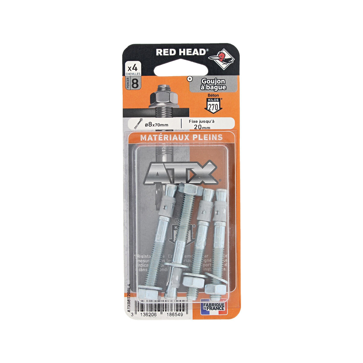 Blister de 4 ATX 8x70mm.Le goujon à bague ATX permet de fixer de manière rapide et sûre toutes les charges lourdes à très lourdes. Elle est préconisée pour la pose d'applications structurelles dans le béton. Possibilité de fixer des éléments sur des dalles de 80mm. Idéal pour le béton préfabriqué. A utiliser pour la fixation des constructions métalliques, garde-corps, consoles, échelles, escaliers, chemins de câble, pièces métalliques et tasseaux. Fabrication française.Spécifications techniques