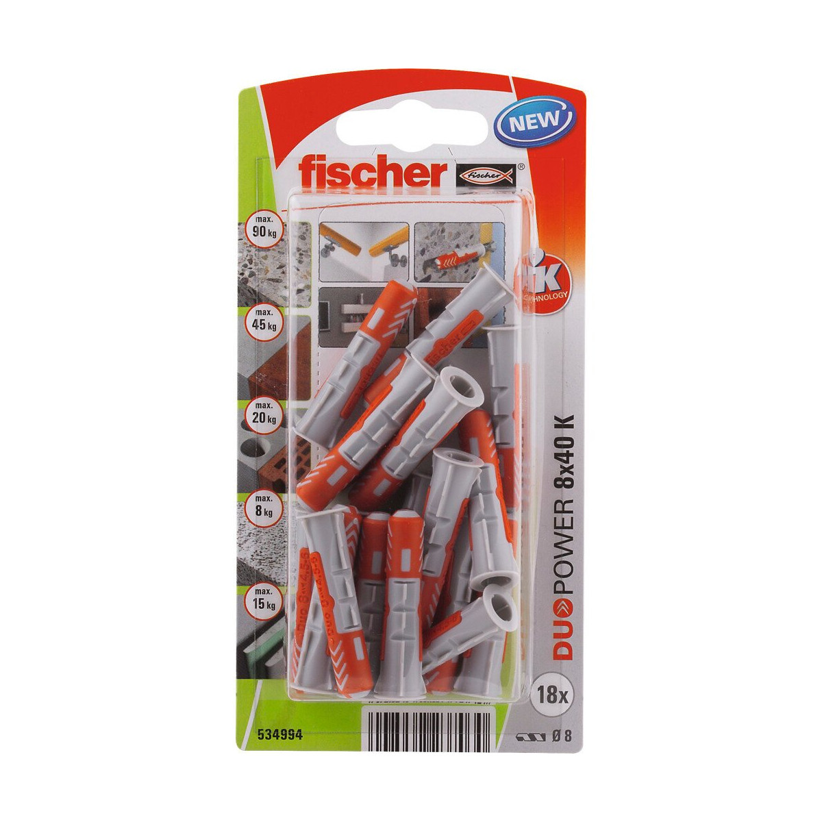 Cheville DUOPOWER tous matériaux. Offre une grande résistance grâce à ses 2 composants : composant gris nylon haute qualité active qui automatiquement le mode de fonctionnement optimal en fonction du matériau de construction pour une tenue optimale : et ailettes d'expansion du composant rouge favorisant une expansion sûre et sécuritaire. Vissage facile sans rotation de la vis. Collerette évitant le glissement de la cheville dans le forage. Ergots anti-rotation. Dimensions 8x40mm.Spécifications techniques
