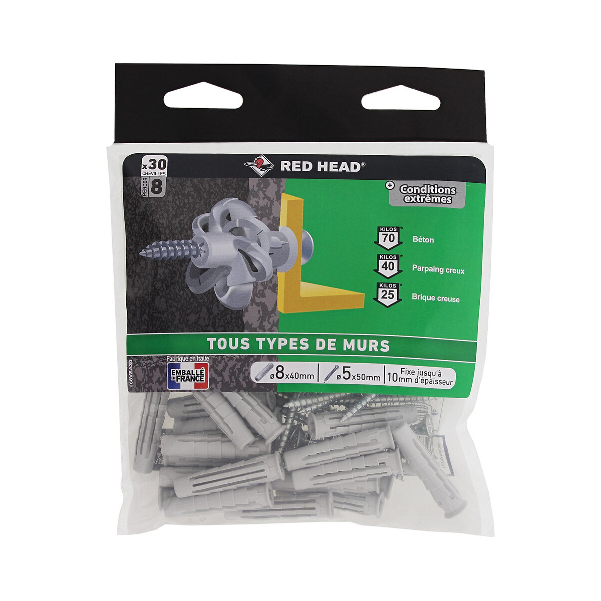 Sachet de 30 chevilles Nordtech 8x40mm + vis TF 5x50mm